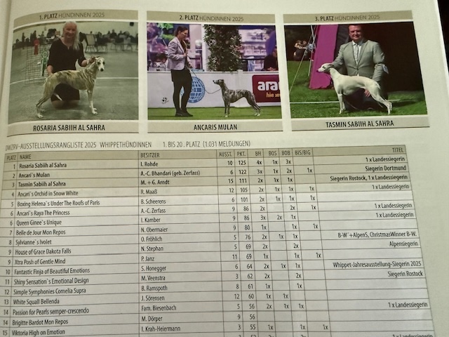 Die Ausstellungsrangliste des DWZRV des Jahres 2025 erschien in dieser Woche in der UW. Wir freuen uns sehr, dass Penny mit nur 5 Ausstellungen (das ist wirklich wenig!) Platz 14 erreicht hat. Damit hatte ich gar nicht gerechnet bei über 1000 Meldungen.