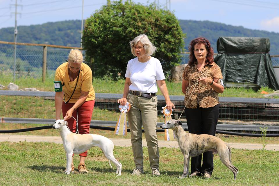 Heute fand im Rahmen der Summer-Trophy eine CAC-Ausstellung in Kleindötting/CH statt, zu der die Rassespezialistin Frau Dr. Bennemann/D eingeladen war, die Whippets zu bewerten.