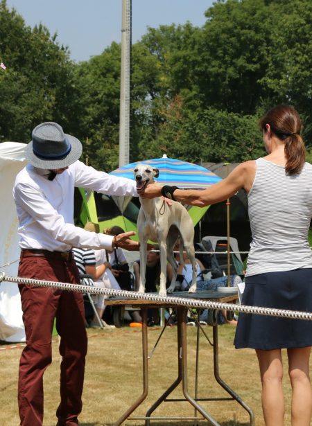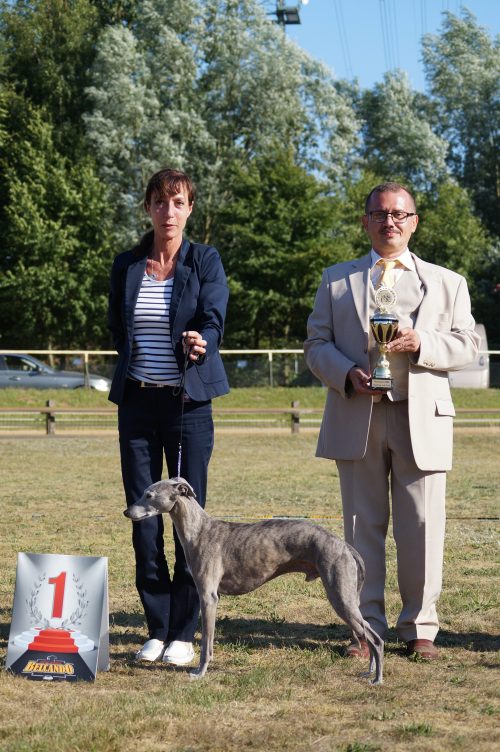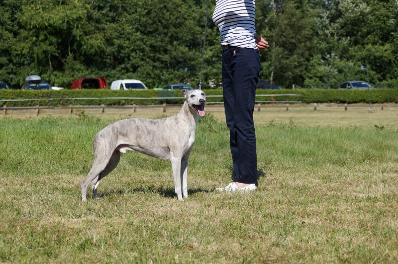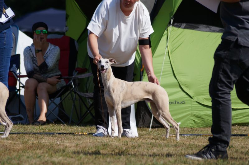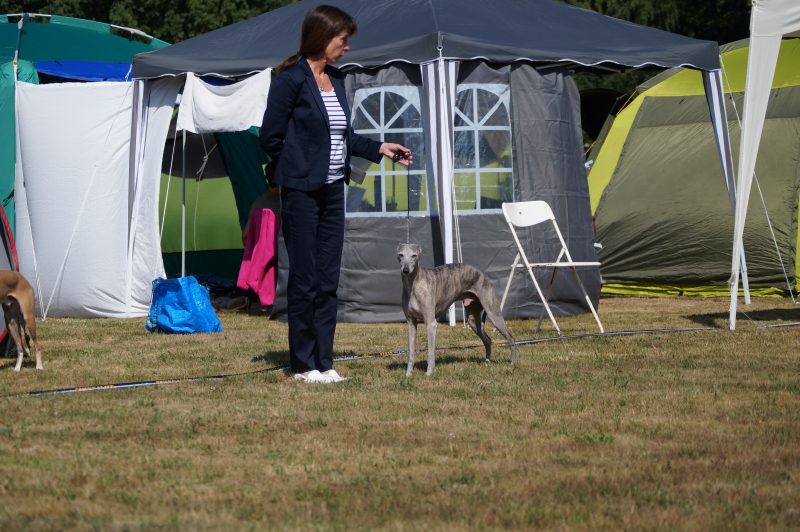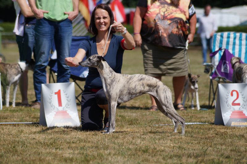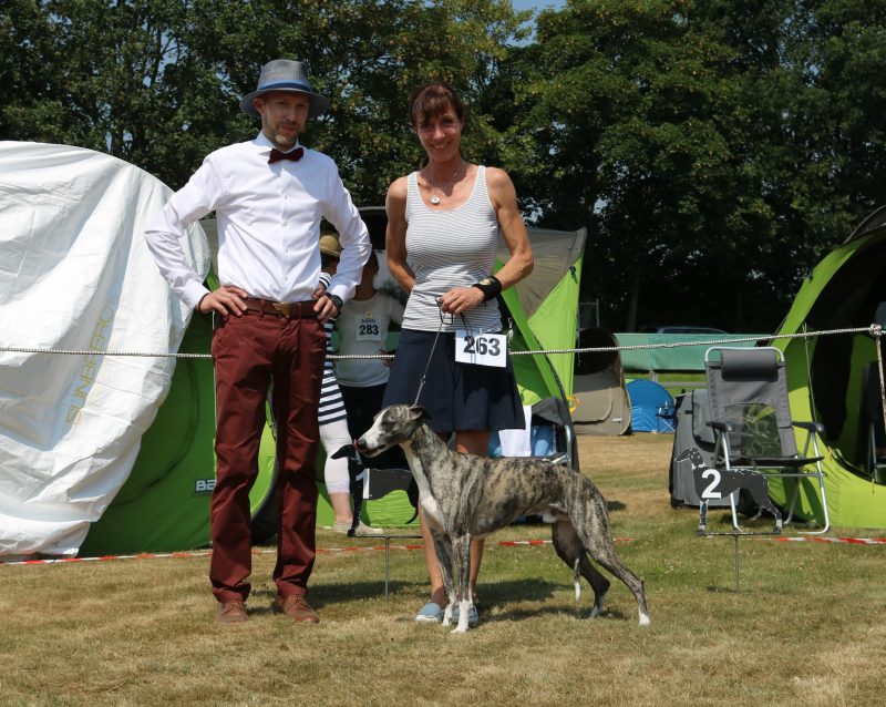 Wir hatten insgesamt fünf Whippets aus „der Familie“ gemeldet. Den Anfang (sogar mit der Startnummer 1) machte Fynn, Feivel of Dulmanian Stars in der Veteranenklasse der Rüden, die er mit Platz 1, Vet.CAC und dem Titel „Landesveteranensieger N/M-V 2018“ gewann. Auch im Stechen stetzte er sich gegen die Veteranen-Hündin durch und wurde Veteranen-BOB!