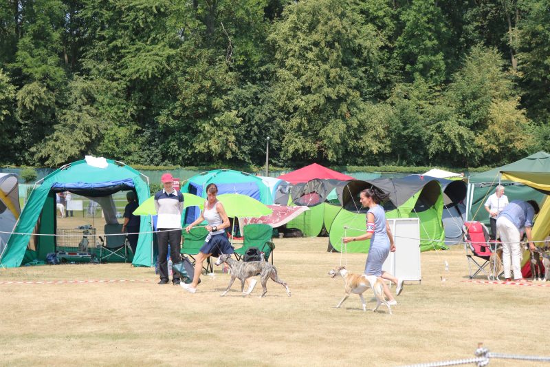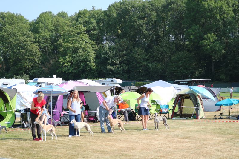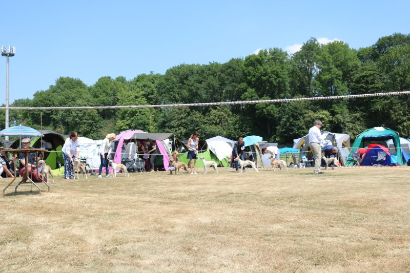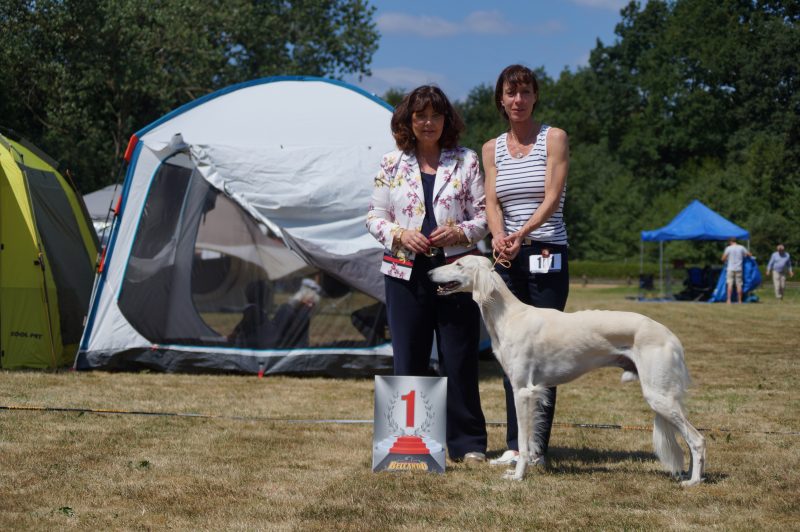 Zeitlich etwas mit den Whippets überschnitten hatte sich die Bewertungen der Salukis. Da ich aber eine riesen Freude daran habe, große Windhunde auszustellen, haben Anke und ich es mit einigem Hin- und Her-Wechseln geschafft, dass Louis, Ch.Macello Sawahin, mit mir die Championklasse und später das Stechen um das BOB gewinnen konnte. Auch er wurde Landessieger N/M-V 2018! und war mit dem BOB für den Ehrenring qualifiziert.