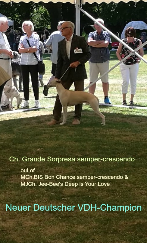 Der tollen Nachrichten aber nicht genug. Gianni, Ch. Grande Sorpresa semper-crescendo, trat auf der CACIB in Ludwigshafen in der gut besetzten Championklasse der Rüden an und erhielt von der (finnischen?) Richterin, Frau Janzon, das V2, R-VDH. Das aber wird aufgewertet, weil der schöne Ron, Culture Pearl’s Moonwalk, bereits VDH-Champion ist.