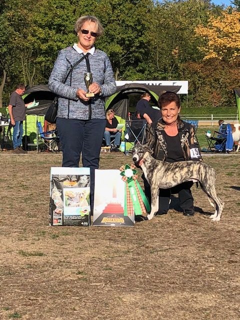 Gestern fand in Gelsenkirchen eine CAC-Ausstellung statt, zu der Frau Wagner/LUX eingeladen war, die knapp 50 gemeldeten Whippets zu bewerten. Ruth kam aus der Schweiz angereist und hatte neben Lenny auch zwei Söhne von unserem Miro, Int.MCh Bon d’Or semper-crescendo, gemeldet.