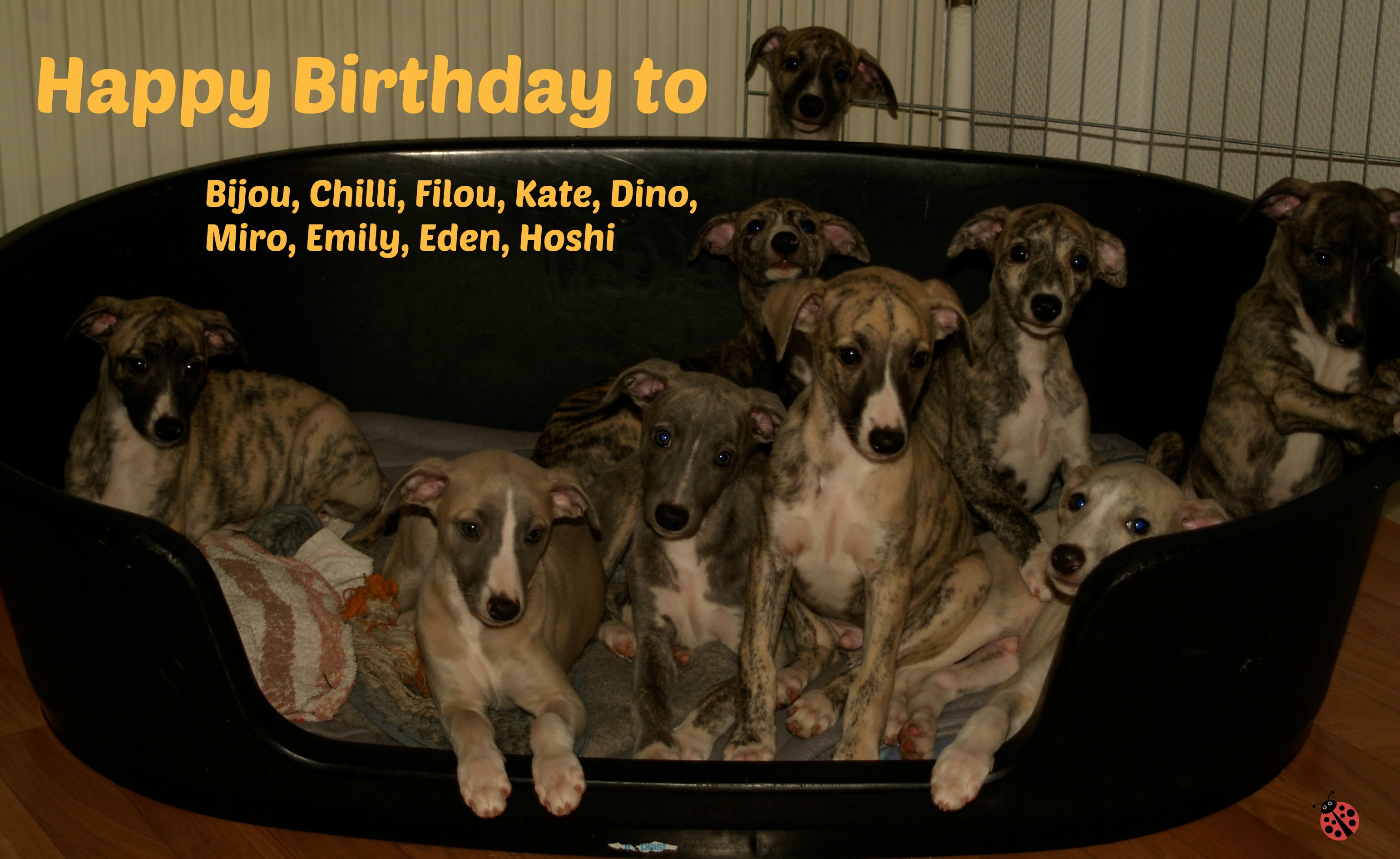 Die vier ungestromten, die im Moment noch braun erscheinen, werden einen tollen hellen Sandtton bekommen. Von unten nach oben: Rüde, Hündin, Rüde, Hündin