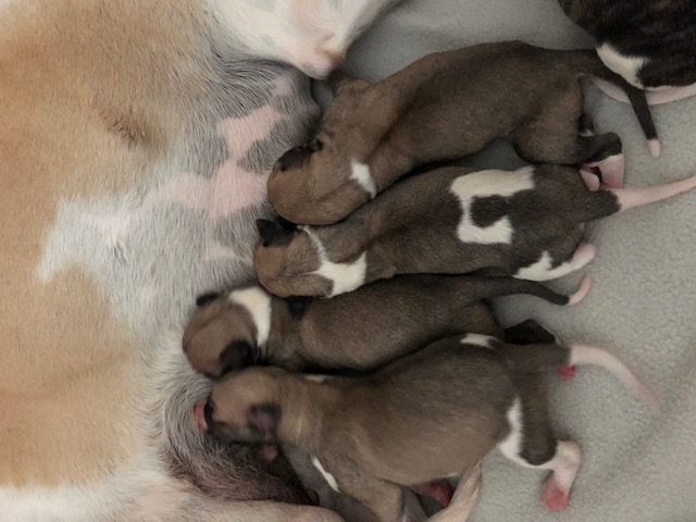 Die vier ungestromten, die im Moment noch braun erscheinen, werden einen tollen hellen Sandtton bekommen. Von unten nach oben: Rüde, Hündin, Rüde, Hündin