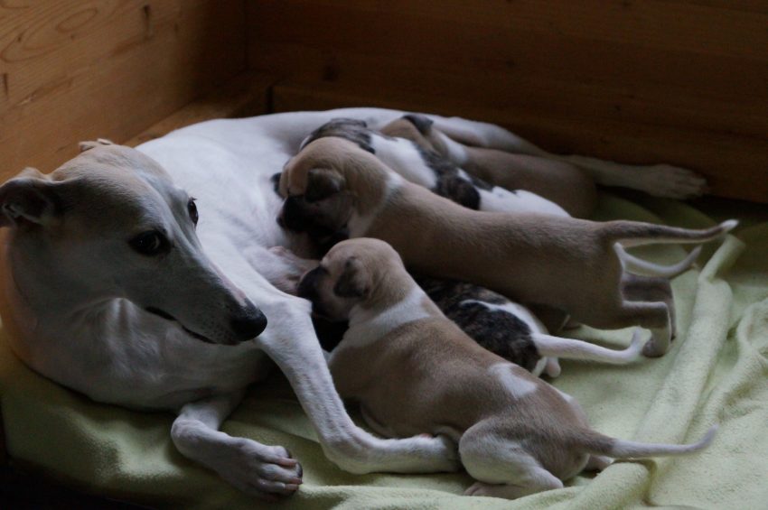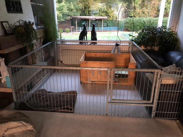 Gestern ist Eve mit den Babies vom Wurfzimmer ins Wohnzimmer gezogen. Dies bedeutete in den ersten Stunden etwas Stress für Eve, da sie noch immer nicht bereit ist, die anderen Hunde in die Nähe ihrer Schätze zu lassen. Schnell aber hat sie verstanden, dass sie hinter dem Gitter sicher ist und sich weiterhin ungestört ihren Mutterpflichten widmen kann. Die Wurfkiste bleibt noch für ein paar Tage geschlossen, solange, bis die Zwerge sicher auf ihren Beinchen stehen und laufen können.