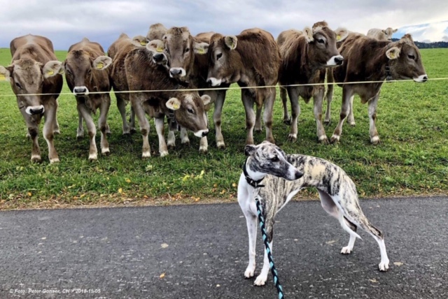 In den schweizer Bergen wird Enya, Grande Galassia semper-crescendo, von neugierigen Kühen begutachtet. Streifen im Fell scheinen sie noch nicht gesehen zu haben 😉