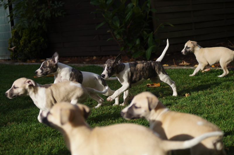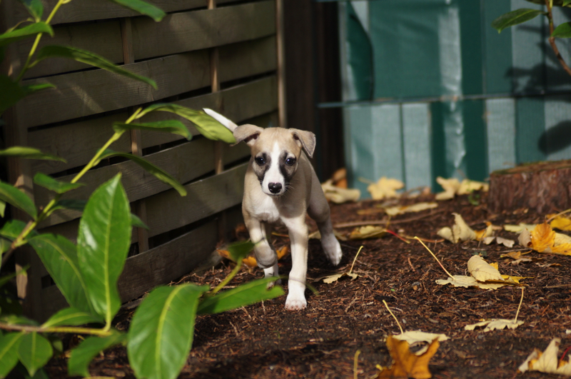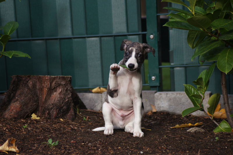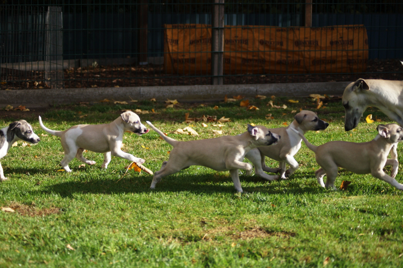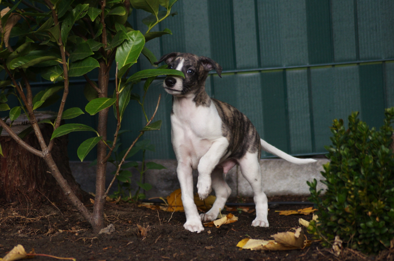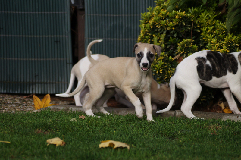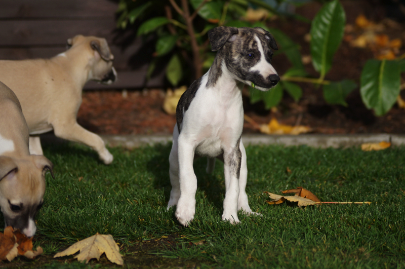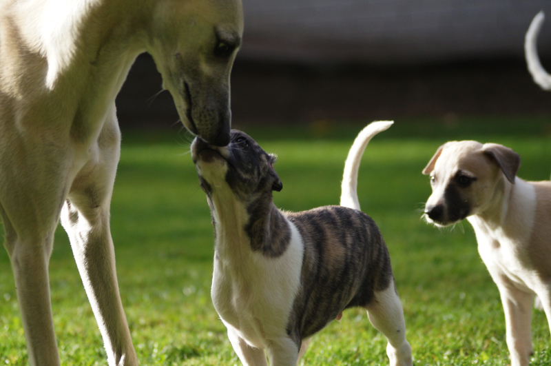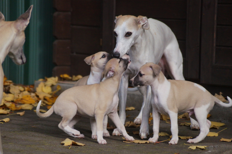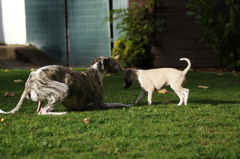 Hui, die letzten beiden Tage waren aufregend für die Zwerge. Zuerst bekamen sie von dem ältesten Whippet, den ich kannte, Lenny (Koseilata’s Untercover Agent) – er wurde 16,5 Jahre alt- ein Kuschelkörbchen vererbt. Zudem trugen die Welpen das erste Mal Halsbänder, was sie alles andere als schön fanden. Es sind süße Bilder entstanden.