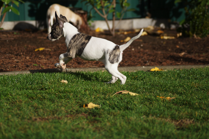 Mit knapp 7 Wochen, testen die Welpen nun schon, wie schnell sie sind. Das mit dem rechtzeitigen Bremsen klappt nicht immer. Da gibt es dann schon mal einen „Auffahrunfall“ 😉