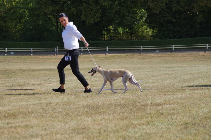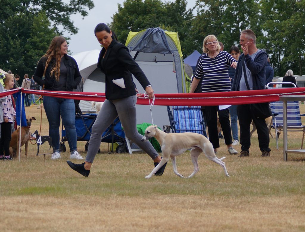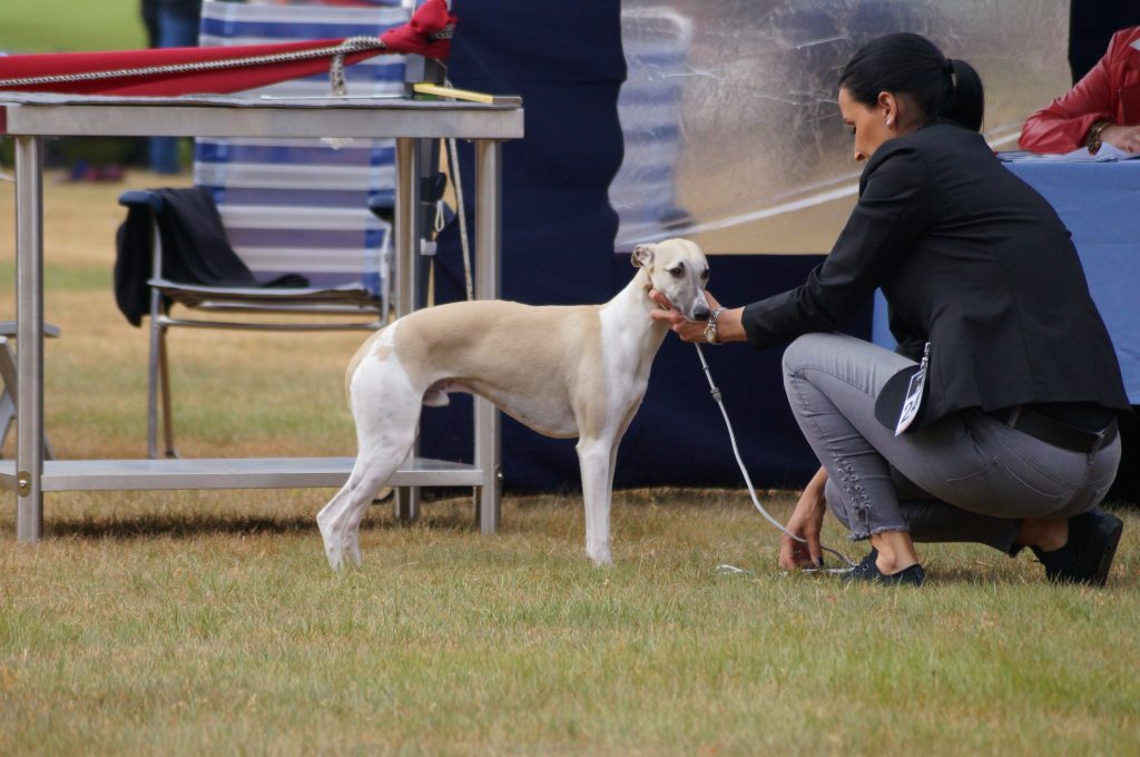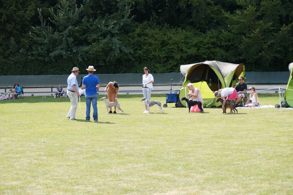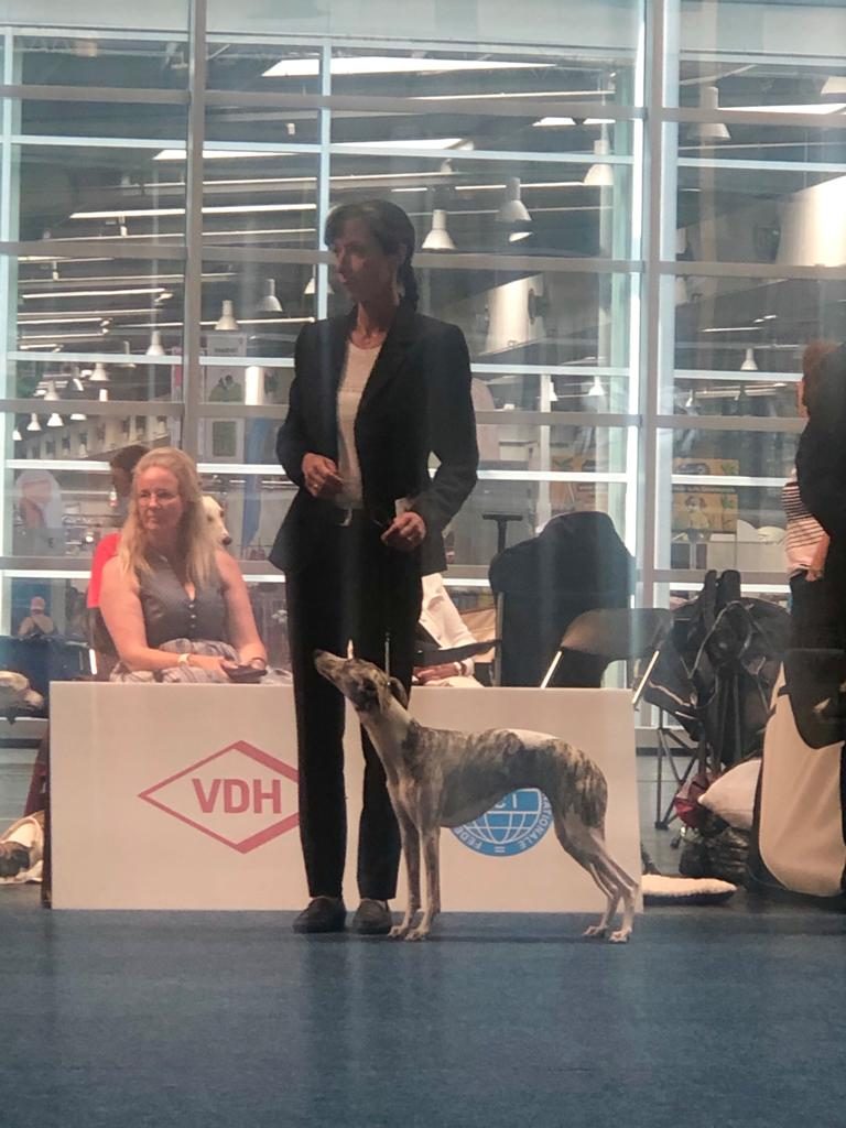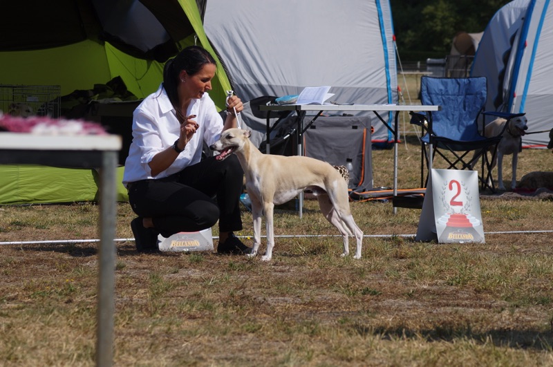 Herr E. Sistermann/D bewertete die Whippets und tat sich in der mit 7 Hündinnen stark besetzten Zwischenklasse schwer zwischen V1 und V2 zu entscheiden. Er ließ die beiden Hündinnen (bei 27 Grad – puhhh) Runde um Runde und immer wieder auf und ab laufen. Letztlich entschied er, Joy auf das wohl erlaufende V 2 zu platzieren.