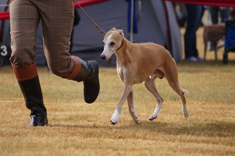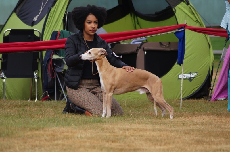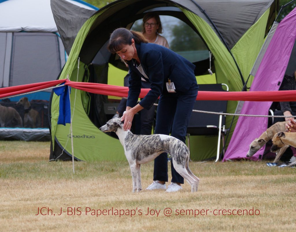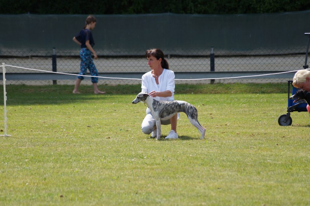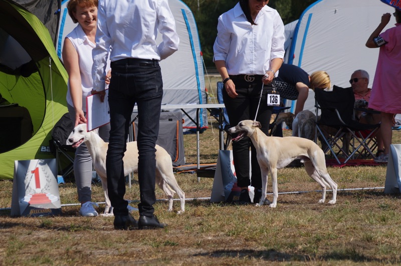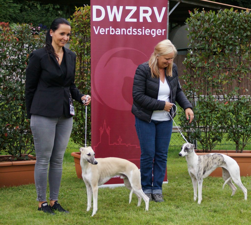 Herr E. Sistermann/D bewertete die Whippets und tat sich in der mit 7 Hündinnen stark besetzten Zwischenklasse schwer zwischen V1 und V2 zu entscheiden. Er ließ die beiden Hündinnen (bei 27 Grad – puhhh) Runde um Runde und immer wieder auf und ab laufen. Letztlich entschied er, Joy auf das wohl erlaufende V 2 zu platzieren.