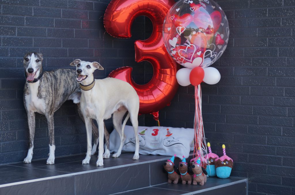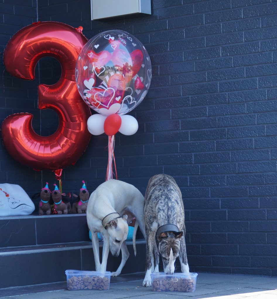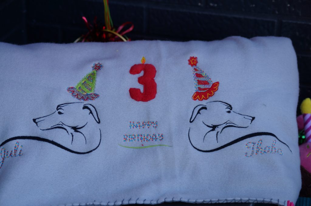 Heute wird unser J-Wurf schon drei Jahre alt. Sandra hat sich wieder eine nette Geburtstagsfeier für Juli und Thabo ausgedacht, die allerdings auf Grund der Welpen bei uns vor der Haustür stattfinden musste.