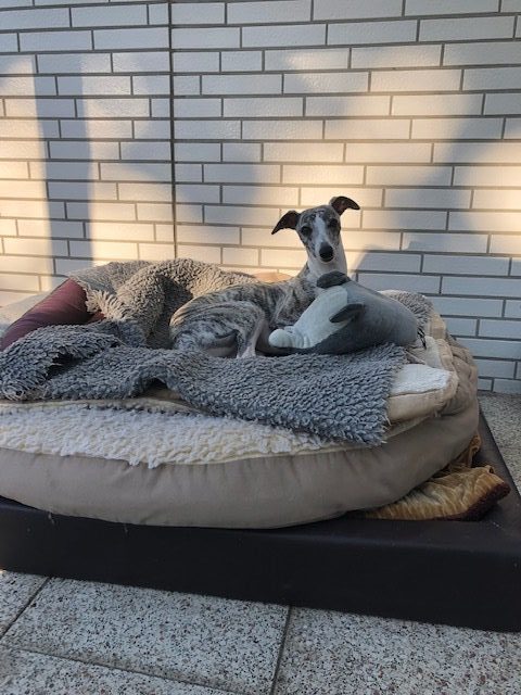 Am Abend stapeln wir alle Hundedecken und Körbchen von der Terrasse auf, um sie über Nacht vor Feuchtigkeit zu schützen. Joy findet das morgens ganz klasse. Weicher und erhabener geht’s nicht 😉