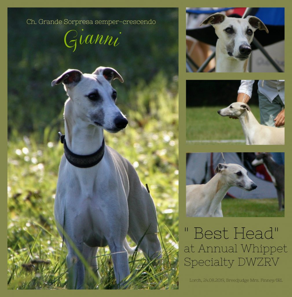 Gianni,Ch. Grande Sorpresa semper-crescendo, sein Sohn, trat in der mit 7 Rüden stark besetzten ChK an, die er mit einem V2 verließ. Allerdings wurde er von der Richterin auserwählt, am Ende des Tages an dem Wettbewerb „schönster Kopf“ teilzunehmen.