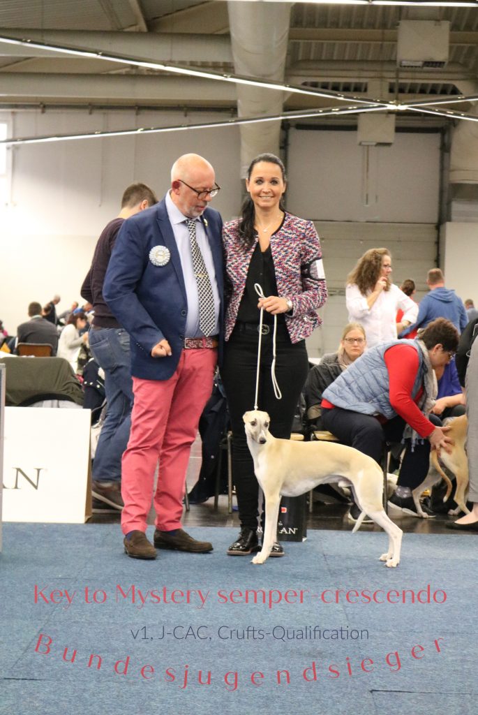 Weiter ging es mit Cuno, JCh., VBJsg ’19 Key to Mystery semper-crescendo, in der Jugendklasse, der zum ersten Mal in einer Halle ausgestellt wurde. Herr Henne war begeistert von ihm und ließ ihn mit V1, J-CAC, J-VDH und somit auch mit dem Titel