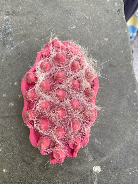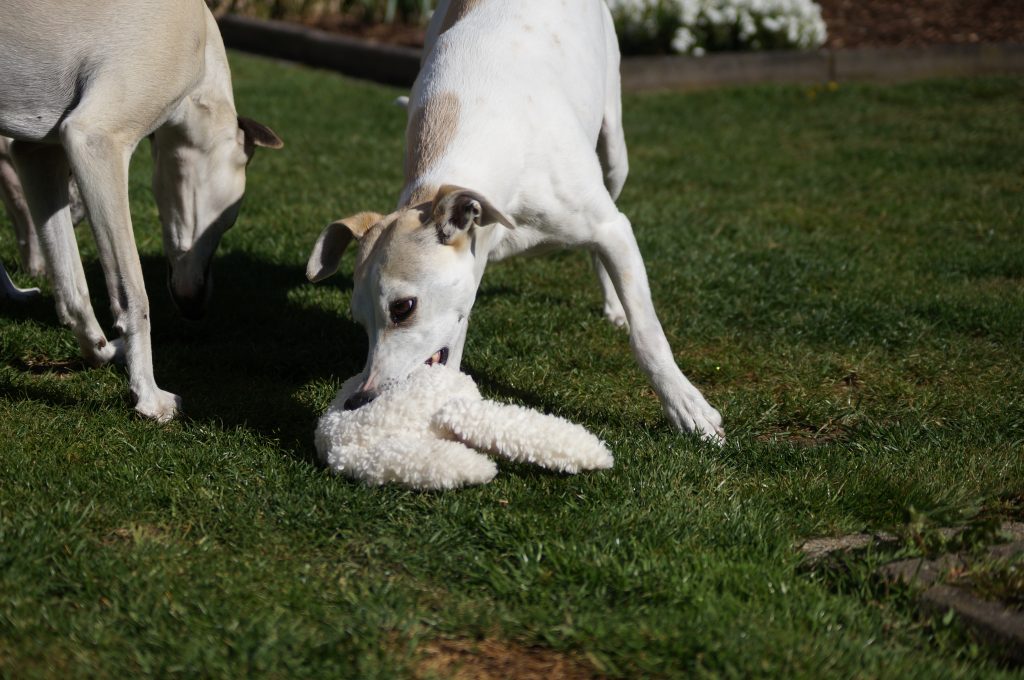 Natürlich lässt Joy es sich nicht nehmen, das Dottie zu klauen, es ebenfalls ordentlich durchzuwalken und zu schütteln. Aber erst einmal eine Runde durch den Garten damit…