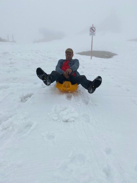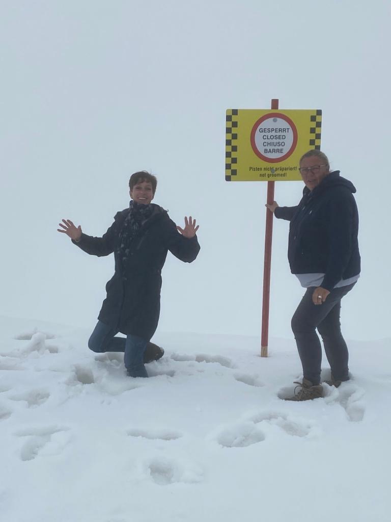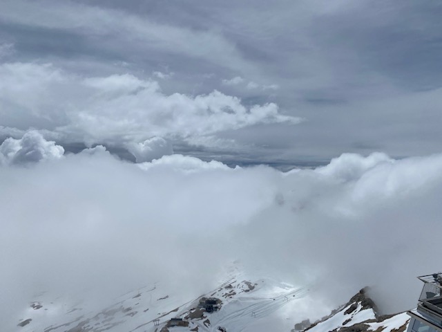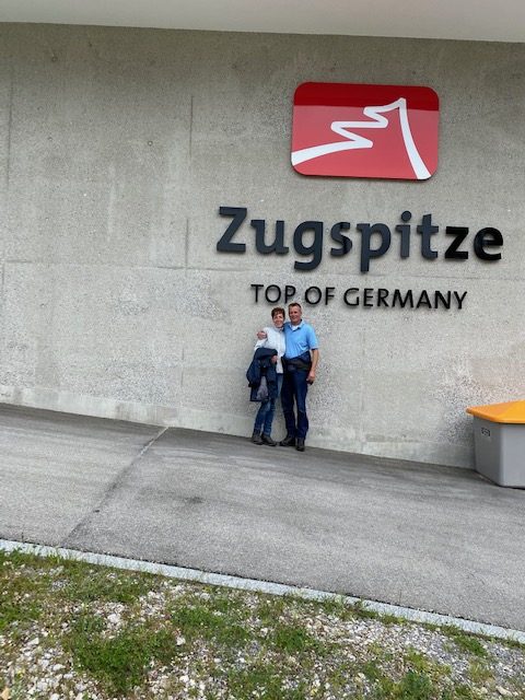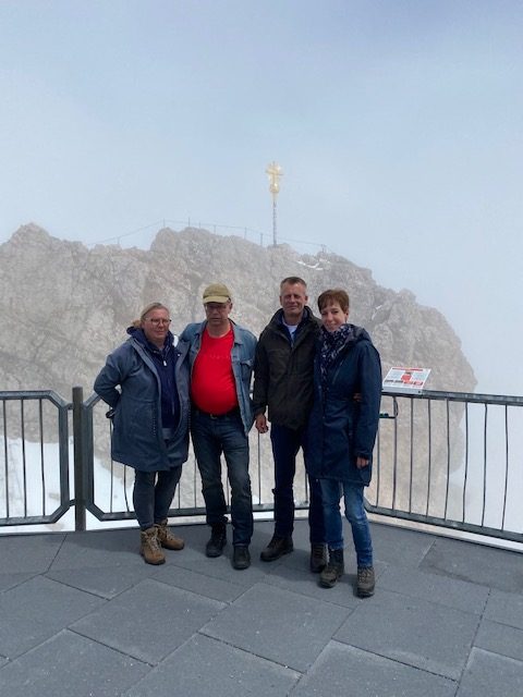 Dank der Vorsaison und Corona, hatten wir freie Fahrt. Kaum ein Mensch war am Eibsee oder in der Zugspitz-Seilbahn. Üblicher Weise steht man dort mehrere Stunden an und teilt sich die Gondel mit 110 Menschen. Wir waren zu acht…Leider blieb uns die atemberaubende Fernsicht auf die Alpen auf Grund des schlechten Wetters verwehrt. Das Ausflugsteam mal ohne Hunde. Anke, Jens, Arnd und Sandra.Danke an Jens für dieses Foto vom höchsten Berg Deutschlandskalt war’s da obenDas Kind im Manne ließ nicht lange auf sich warten. Jens gibt Vollgas wie tief der Schnee nun wirklich war, weiß ich nicht. Bis zum Knie bin ich zumindest versackt. Und das im Hochsommer!Den Weg bergab haben wir ganz klassisch mit der Bayrischen Zugspitzbahn absolviert.