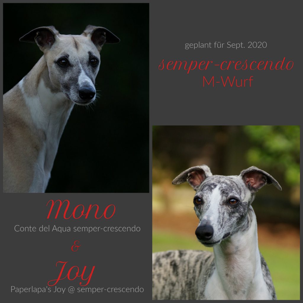 Gestern haben wir unseren M-Wurf auf den Weg gebracht. Vater dieses Wurfes wird Mono, Conte del Aqua semper-crescendo, sein. Mono sieht für sein Alter fantastisch aus, mit wachem Blick und einer tollen körperlichen Kondition. Auf seine charmante Art überzeugte er auch Joy, Paperlapap’s Joy @semper-crescendo, von sich, so dass wir nun auf ein buntes Knäul M&M-chen im September hoffen. Vielleicht wird es sogar ein Schnapszahl-Wurf, denn der 09.09.2020 könnte der Geburtstermin sein.