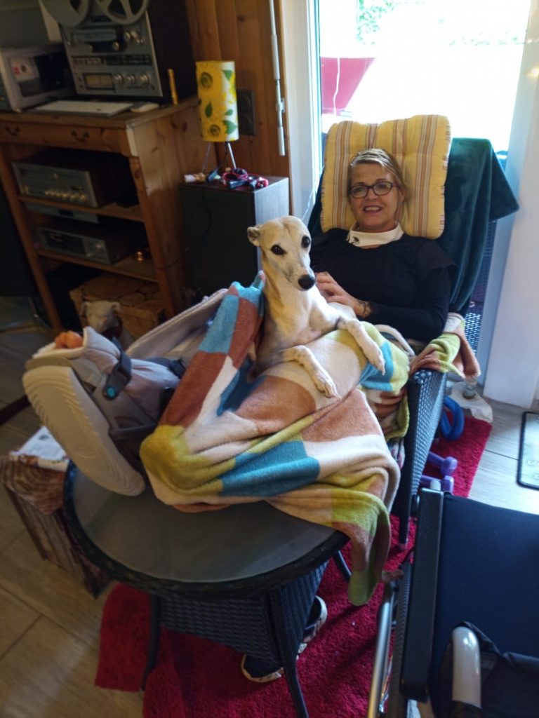 Michaela schickt mir dieses Foto. Wenn man so eine Kuscheltante wie Newt, Jaipur semper-crescendo, an seiner Seite hat, tut der Beinbruch nur halb so weh!
