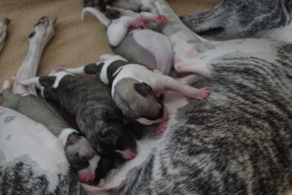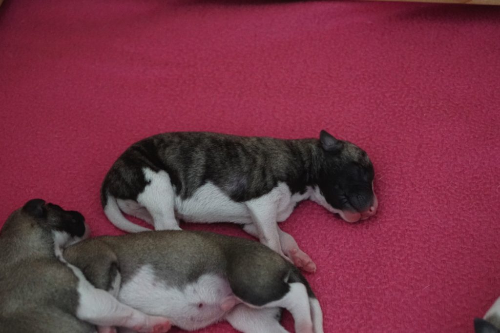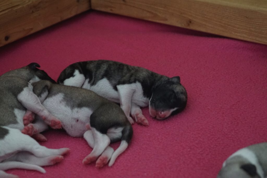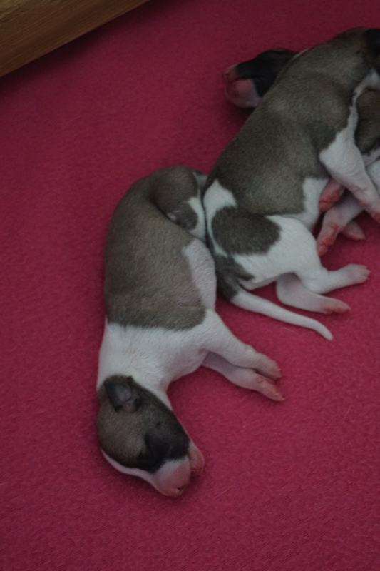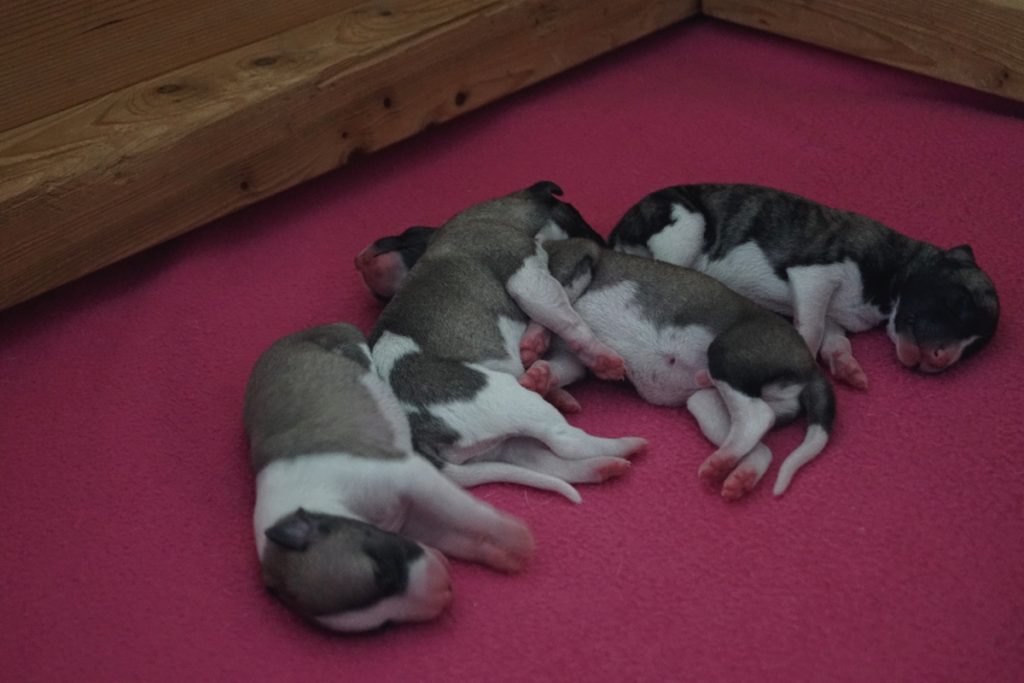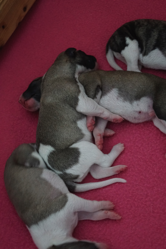 Alle Welpen haben schon ordentlich zugenommen. Joy leistet ganze Arbeit und kümmert sich rührend. Sie verlässt nur zum Pipi-Machen (und das erst nach mehrfacher Aufforderung durch uns) die Wurfkiste.