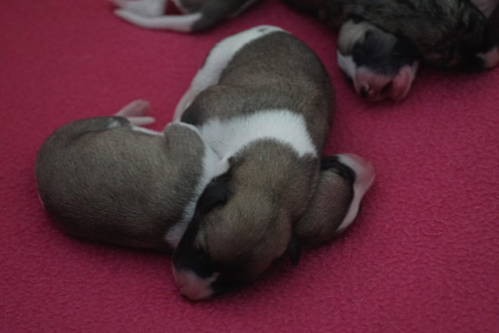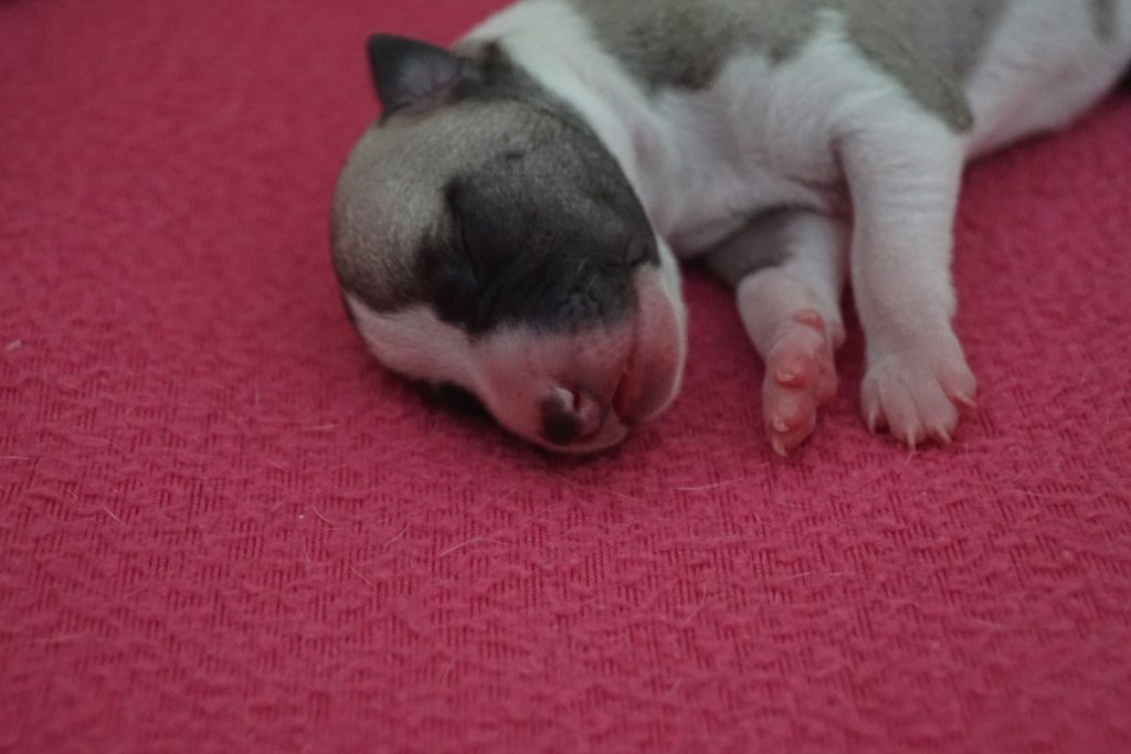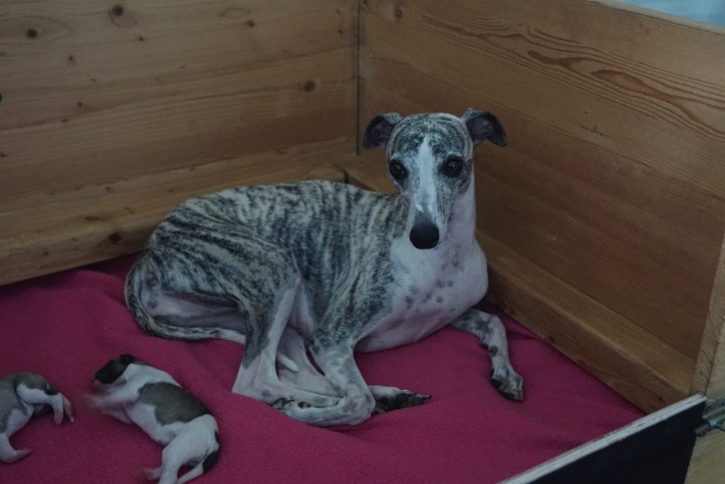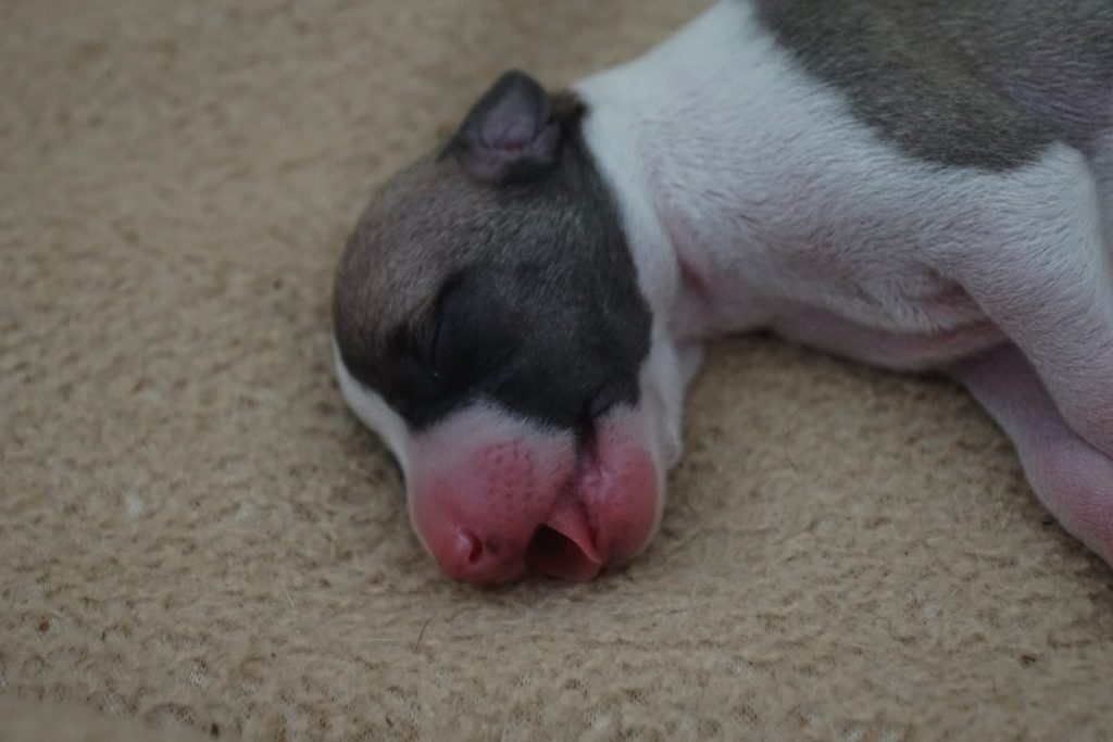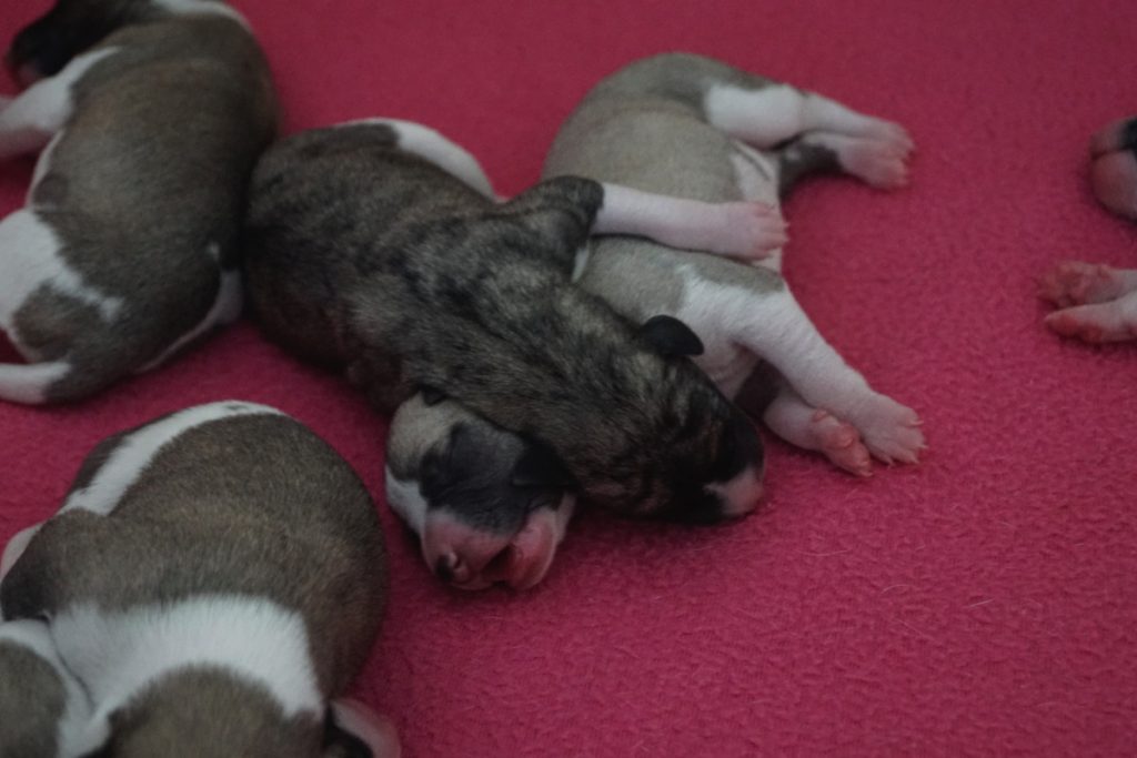 Alle Welpen haben schon ordentlich zugenommen. Joy leistet ganze Arbeit und kümmert sich rührend. Sie verlässt nur zum Pipi-Machen (und das erst nach mehrfacher Aufforderung durch uns) die Wurfkiste.