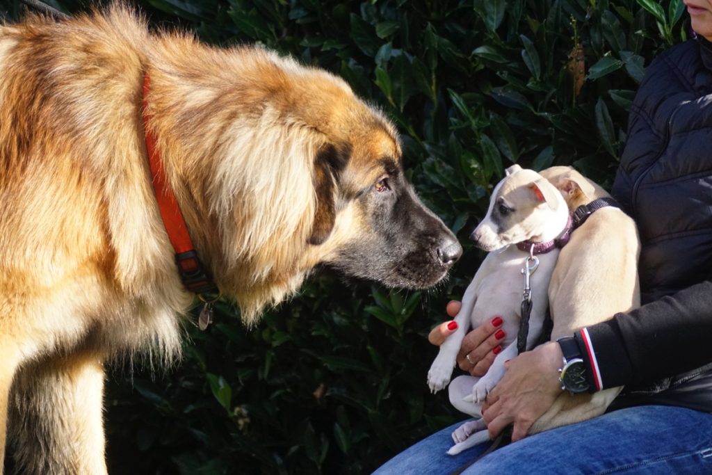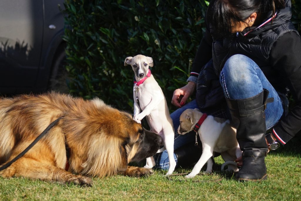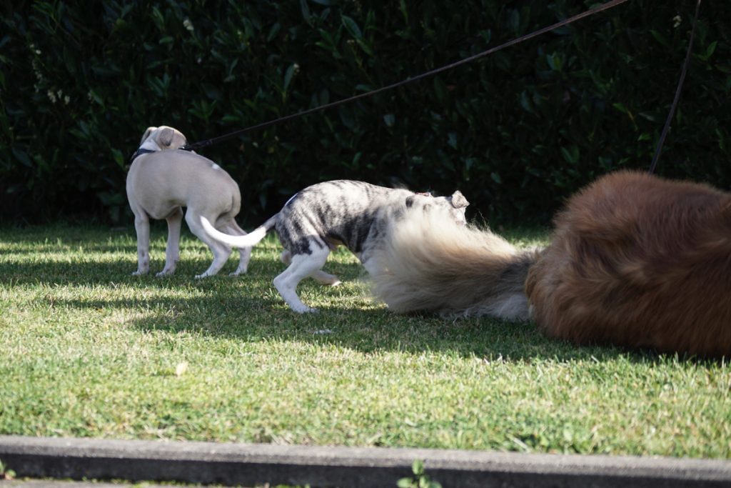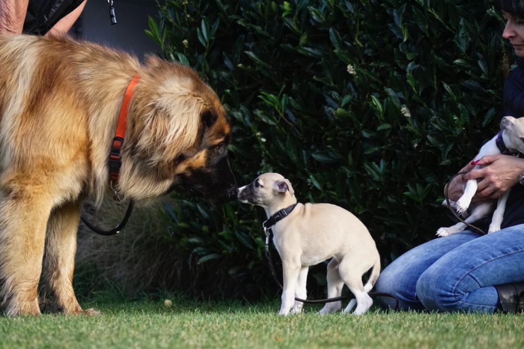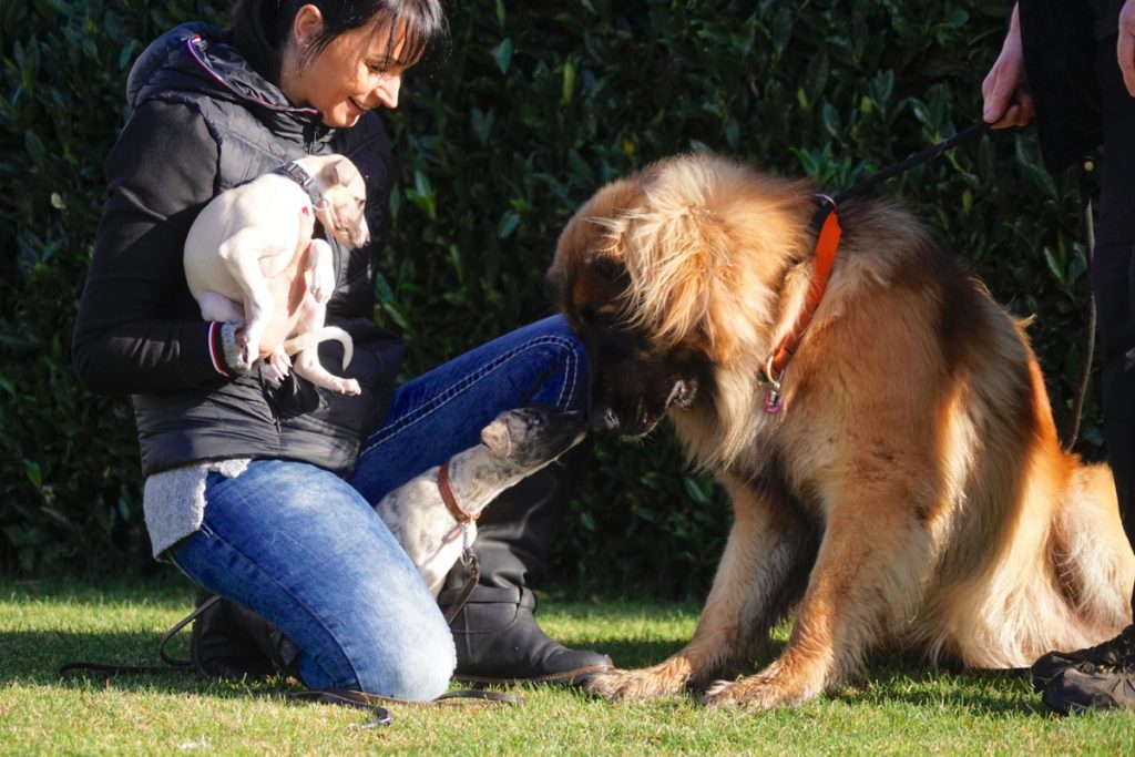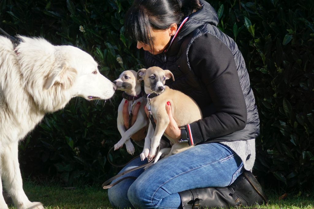 Bärbel mochte die Welpen. Hier schnuppert mutig Lotta. Lovis verfährt eher nach dem Motto: was ich nicht sehe, sieht mich auch nicht…
