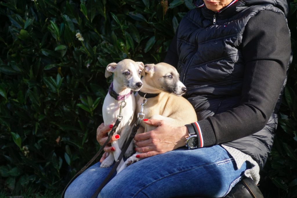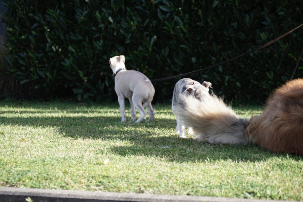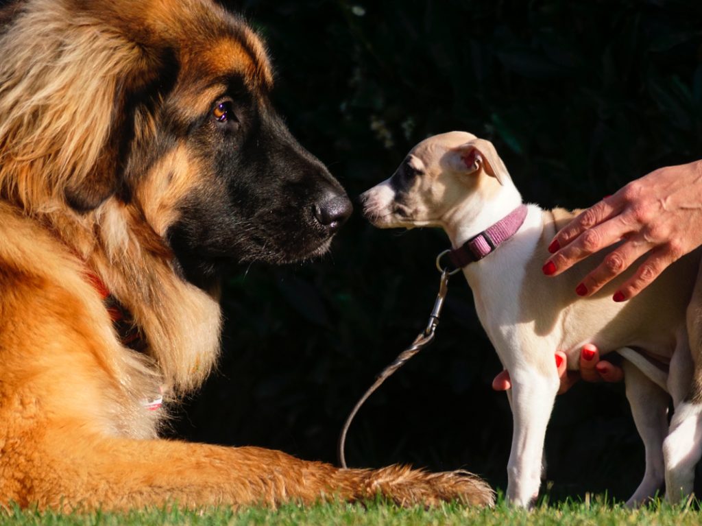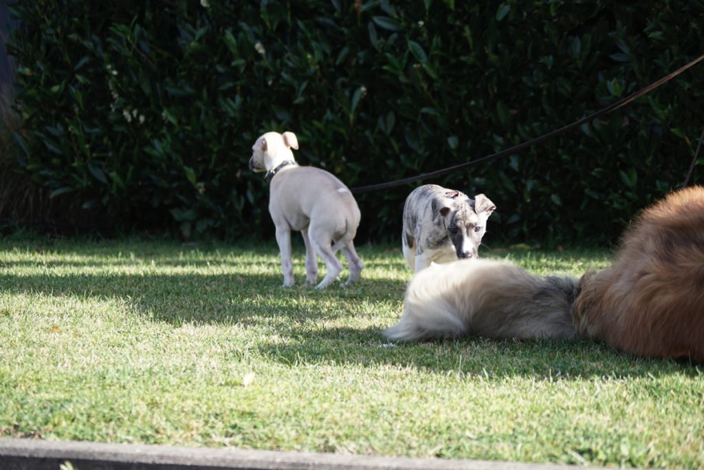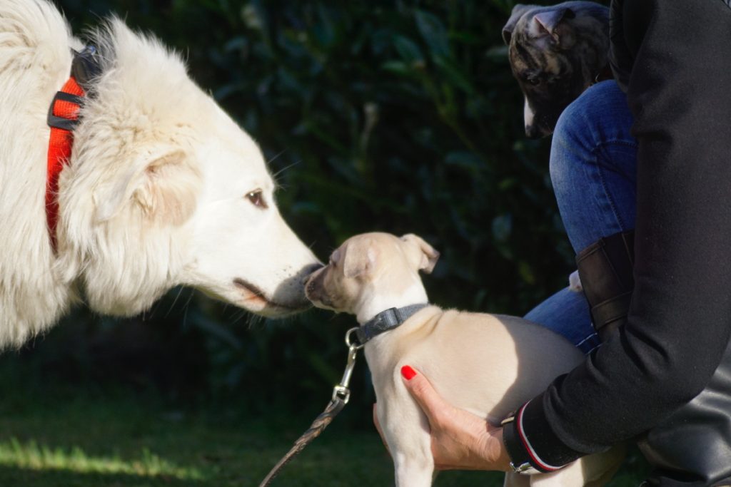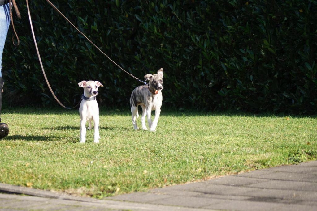 Bärbel mochte die Welpen. Hier schnuppert mutig Lotta. Lovis verfährt eher nach dem Motto: was ich nicht sehe, sieht mich auch nicht…