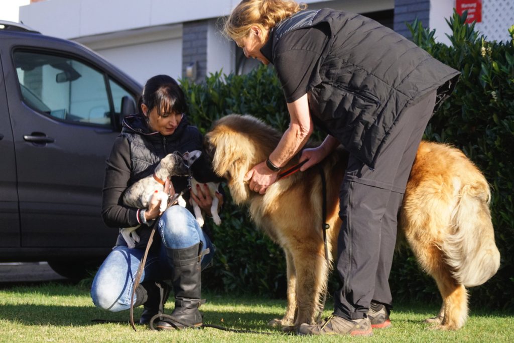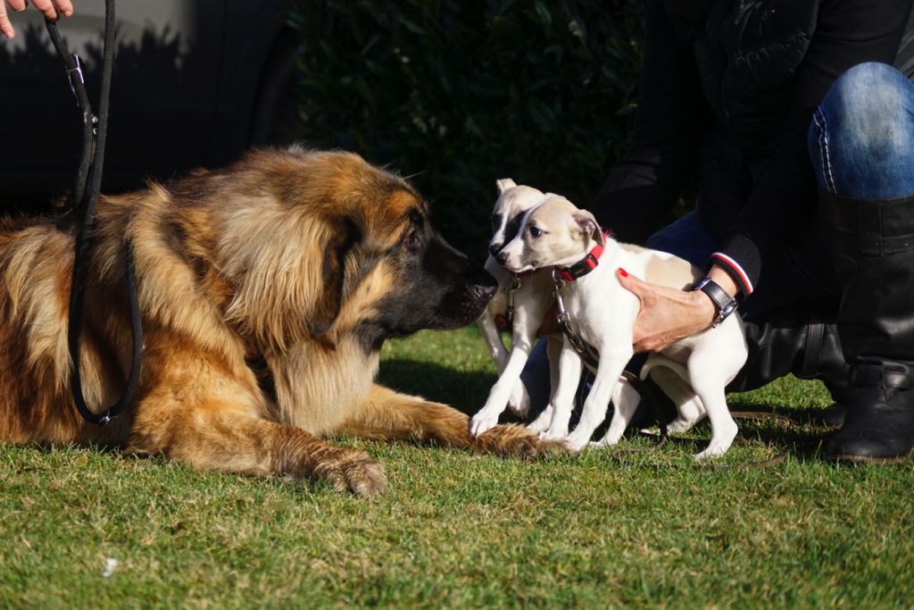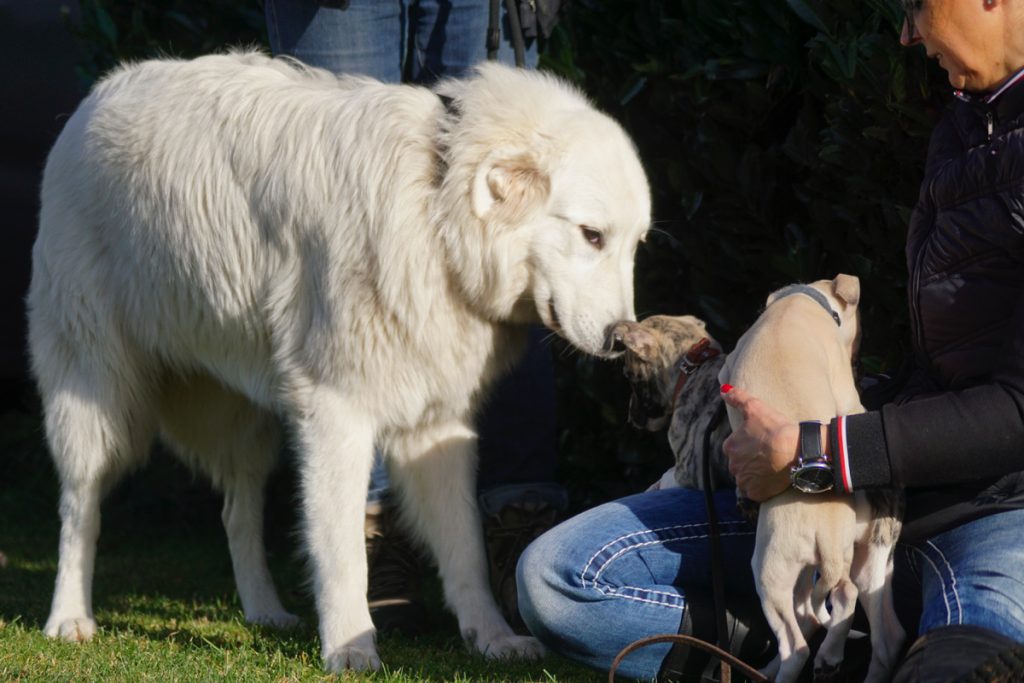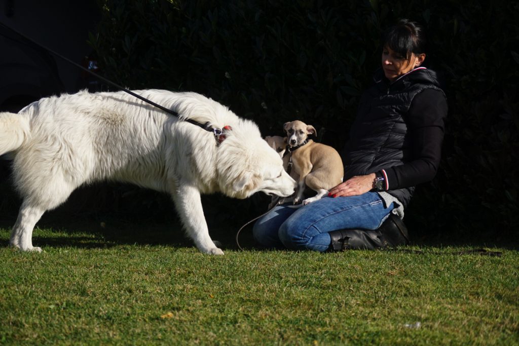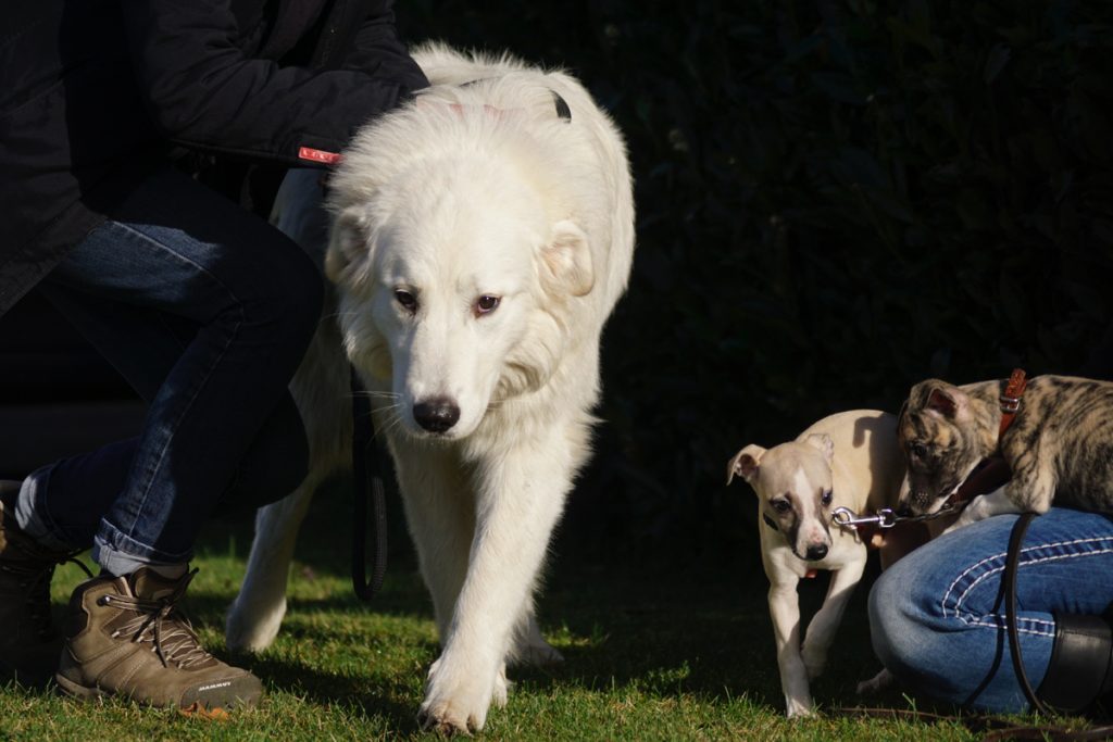 Seit unser Rhodesian Sheikh nicht mehr lebt, sind wir auf liebenswerte „Fremdhunde“ zur Welpenprägung angewiesen. Gestern kamen zwei sanfte Riesen, der Leonberger Bommel und die Maremmano-Abruzzen-Hündin Bärbel zu uns.