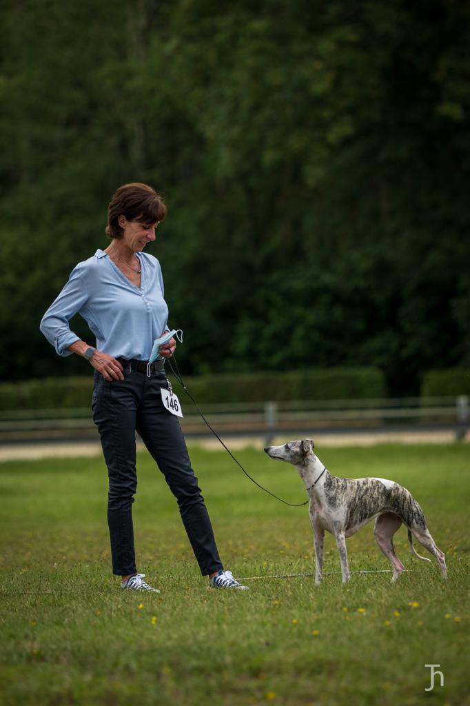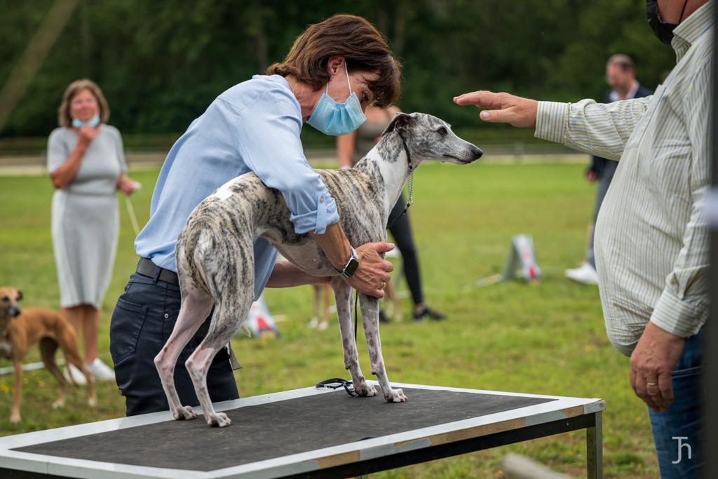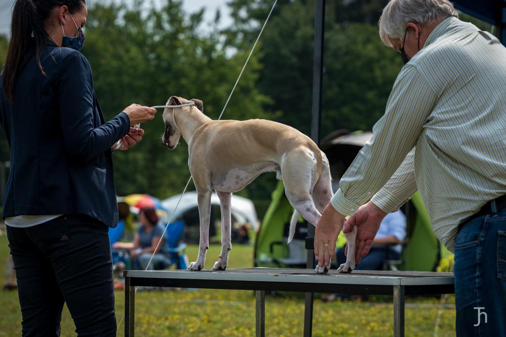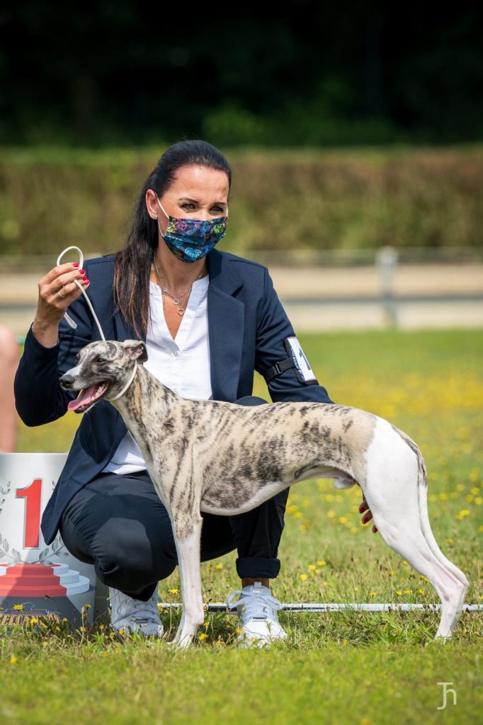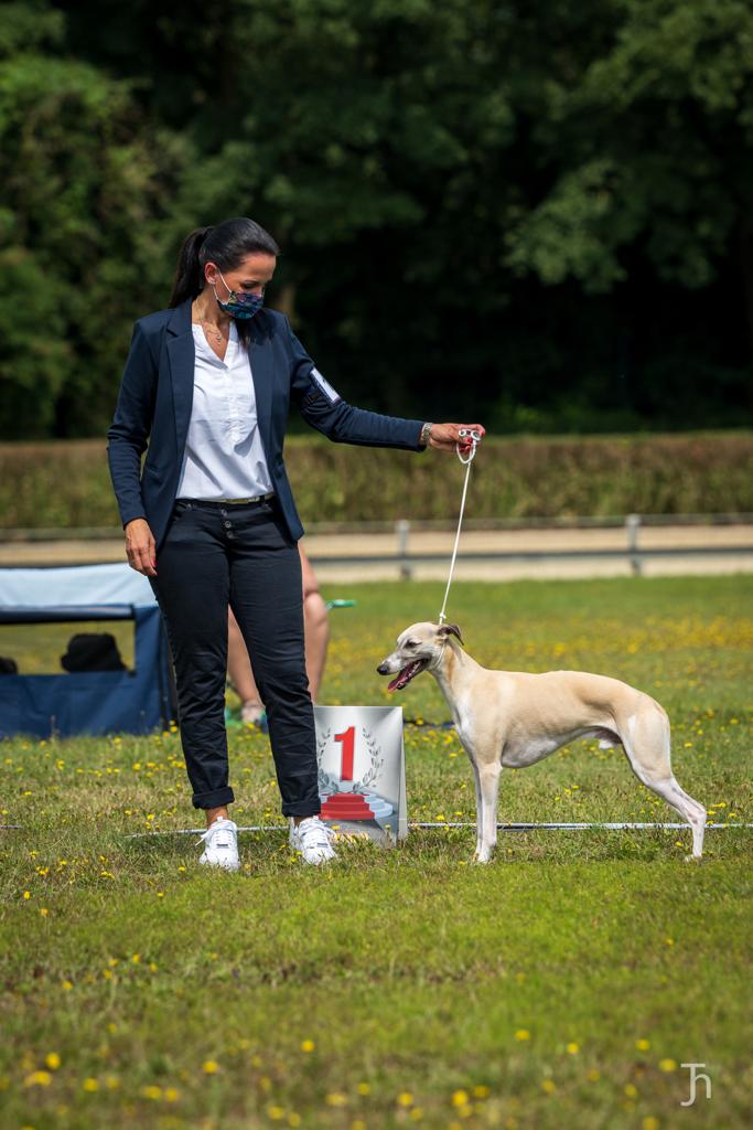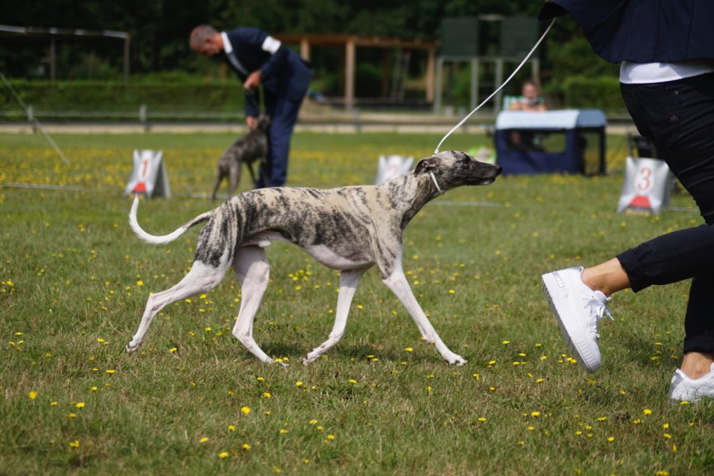 Auch ich stellte aus. Nicht nur Joy, Paperlapap’s Joy@semper-crescendo, sondern zuerst mein liebstes Flusenohr Louis, Macello Sawahin, der tatsächlich zwischenzeitlich 8 Jahre alt ist und in der Veteranenklasse startete, die wir mit V1, Vet-CAC unter Frau Tatjana Urek/NL gewannen. Leider gibt es von mir und Louis kein Foto, denn ich musste fix zurück zum Whippetring. Aber Anke führte Louis letztlich noch zum Vet.BOB! Ganz herzlichen Glückwunsch auch noch zu diesem Erfolg.