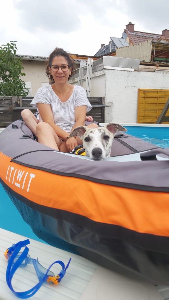 Eine witzige Idee. Jenny übt mit Sky, Neon Sky Blue semper-crescendo, im heimischen Pool den „Ernstfall“. Bald geht es ab in den Urlaub und Sky kommt selbstverständlich mit. An das Tragen der Schwimmweste hat er sich schon gewöhnt und ich bin sicher, das paddeln wird ihm auch Spaß machen.
