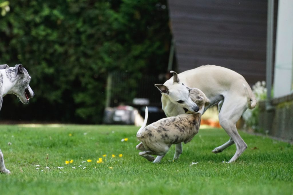 Klein Queenie hat Spaß im Garten und hat ihren ersten Spitznamen schon weg. Sie scheint mit guten Sprungfedern ausgestattet zu sein, die sie auch in jeder sich bietenden Gelegenheit nutzt. Wie Flip hüpft sie hoch, einem tatsächlich in den Arm oder flippt einfach so rum (um nicht aus zu sagen). Die großen holen sie ab und zu auf den Boden zurück 😉