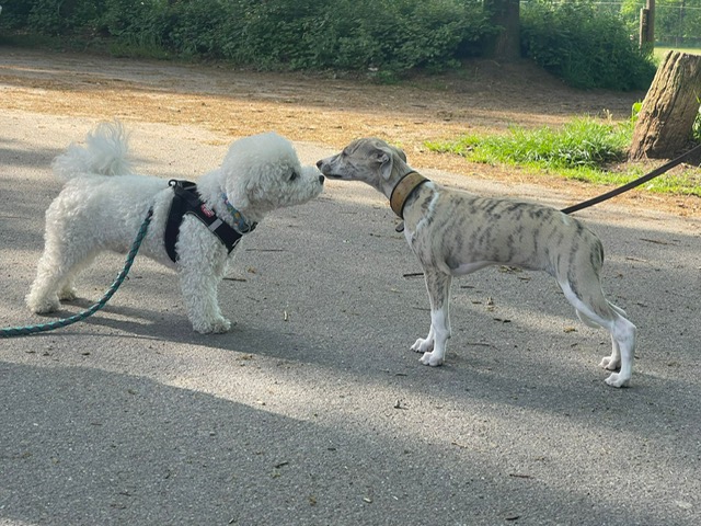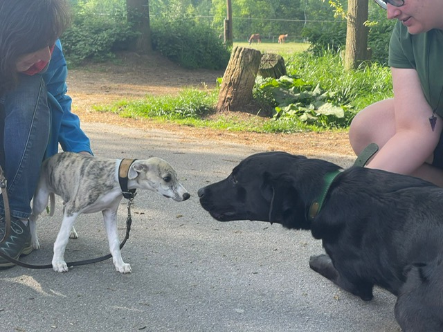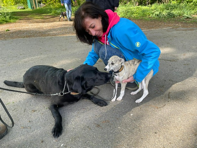 Queenie durfte Bekanntschaft mit verschiedenen Hunden machen, was ihr teils geheuer aber auch ungeheuer war. Vor riesengroß und schwarz kann man im ersten Moment schon mal zurück schrecken. Mit Ermutigung hat es dann doch vorsichtigen Kontakt gegeben.