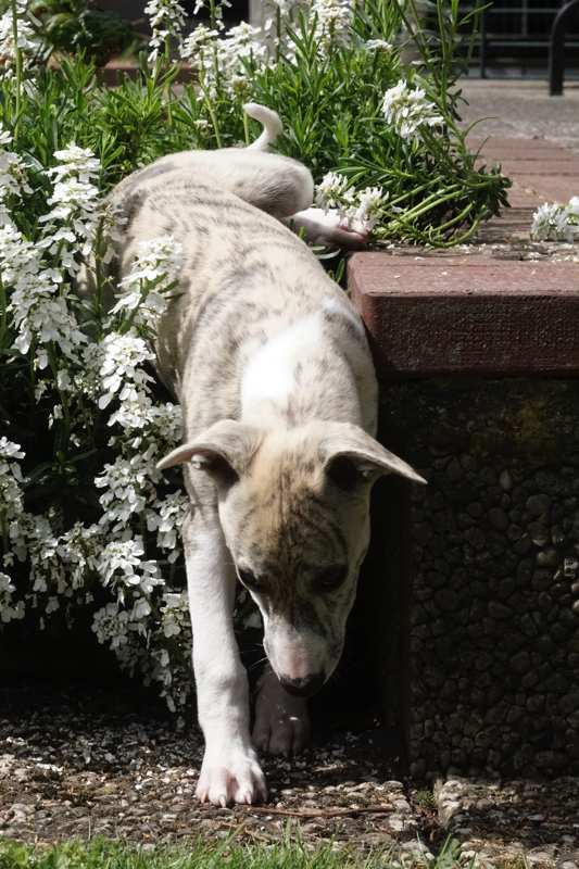 Queenie hat sich hier in Windeseile eingelebt, Haus und Garten erkundet und die Wege schon ganz gut im Griff. Den Garten liebt sie und verbringt bei dem tollen Wetter ihre Zeit am liebsten draußen. Allerdings unterscheidet sich ihre Vorstellung davon, in welchem Zustand Blümchen am besten aussehen, konträr zu meiner. 😉