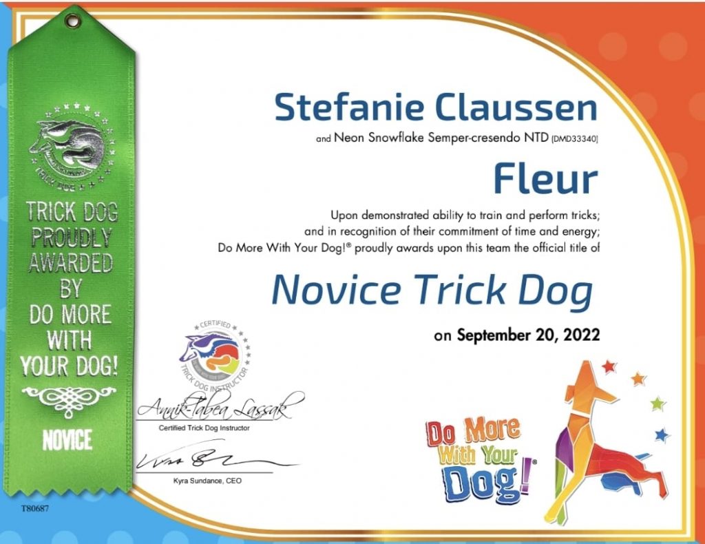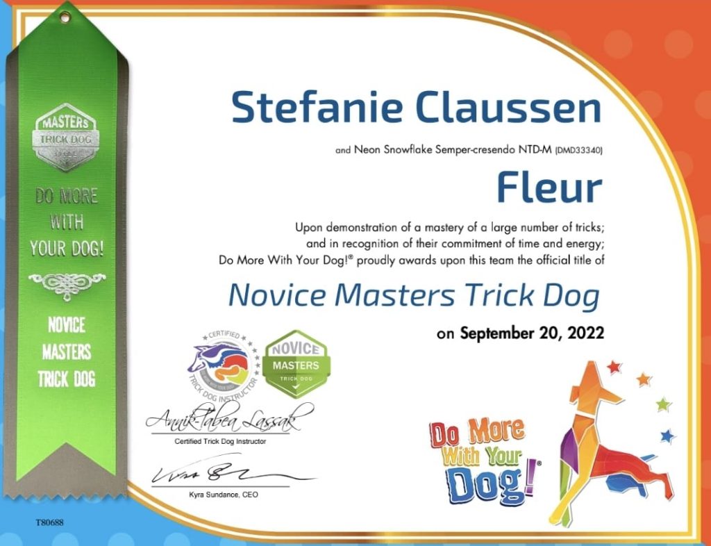 Fleur erreichte direkt zwei Titel, die sie nun offiziell führen darf , NTD (Novice Trick Dog) und NMTD Novice Master of Trick Dog) und wird in der Liste der Champions geführt.