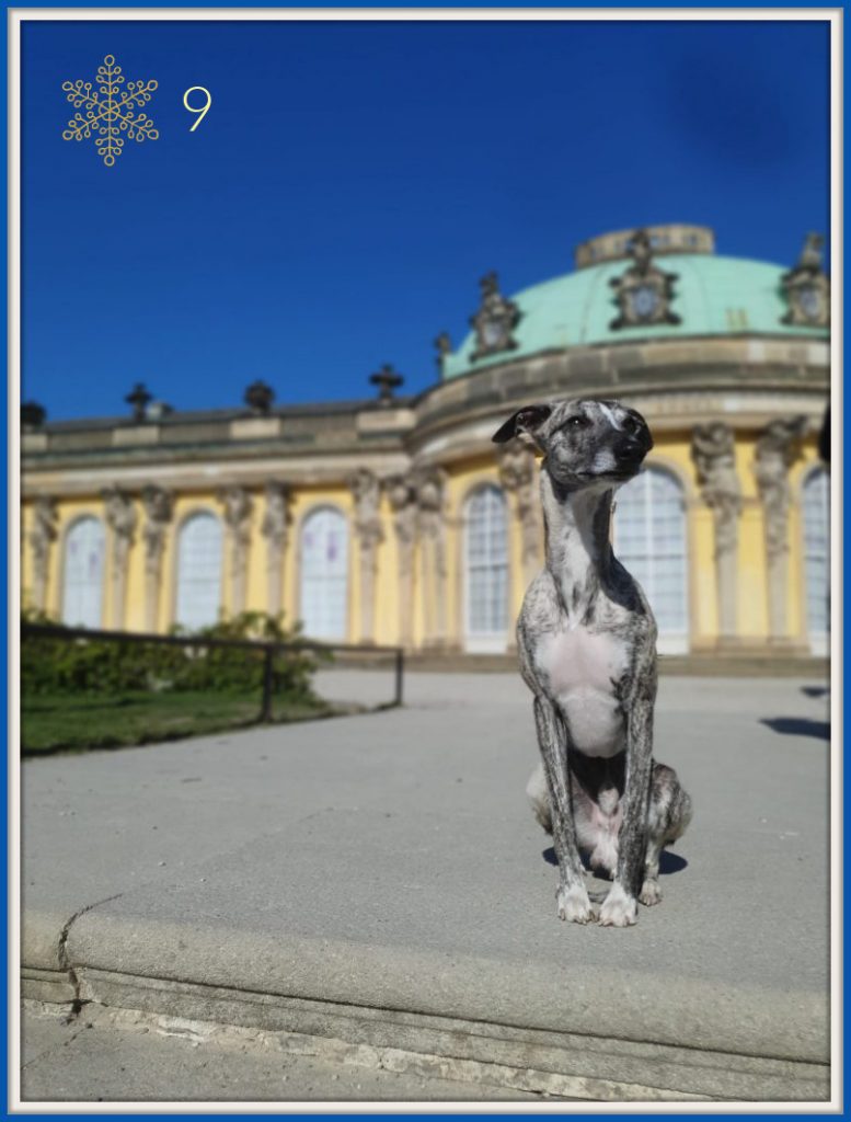 Hund und Kultur geht immer! Rumo, Neon Nightrider semper-crescendo vor dem Schloss Sanssouci