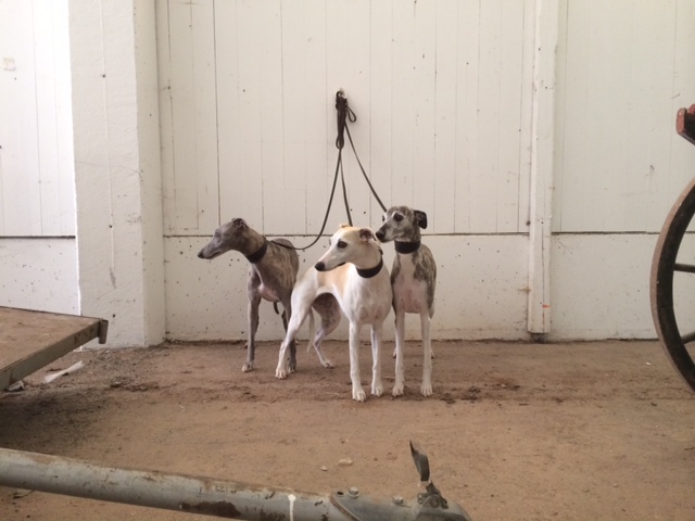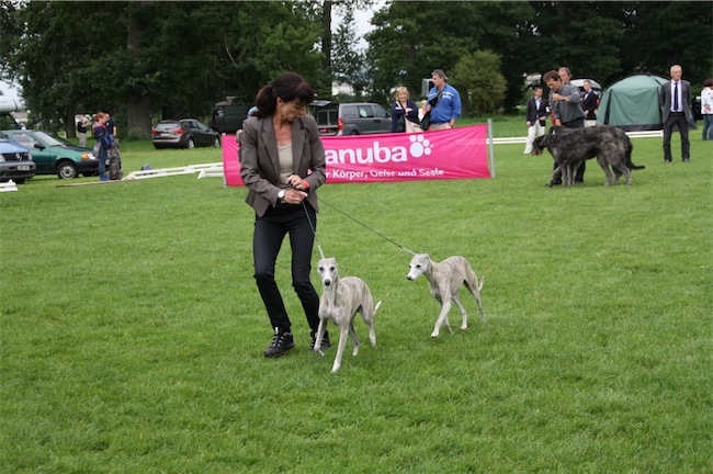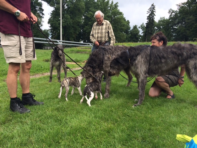 klein trifft groß: Eni und Luna beschnuppern Deerhounds am Ringrand