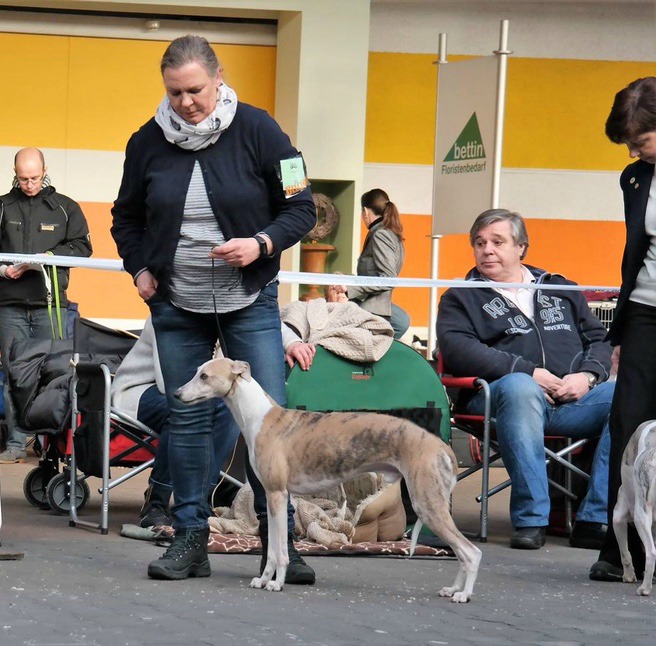 Anke hat sich mit Anton, Rollerblade von der Oelmühle, am Wochenende zur CAC-Ausstellung nach Langerwisch begeben. Frau Ralfe/ZA richtete am Samstag u.a. die Whippets.