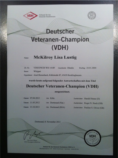 Ganz besonders stolz machen mich die Namen der beiden weltweit angesehenen, englischen Richter Roger Stock (Courthill-Whippets) und Pauline Oliver (Spanyfly-Whippets) auf dieser Urkunde. DANKE.