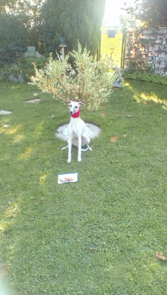 Newt, Jaipur semper-crescendo, hat zum Geburtstag einen extra-Teller Fleischwurst bekommen.