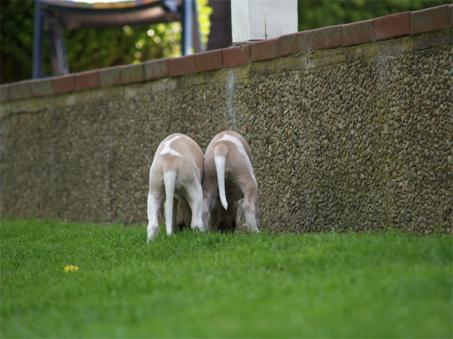 Jetzt können wir keinen Schritt mehr durch den Garten gehen, ohne die Zwerge an den Schnürsenkeln hängen zu haben. An Gartenarbeit ist gar nicht zu denken! Es macht unheimlich viel Spaß ihnen zuzusehen. Ihre Beine koordinieren sie schon richtig gut, nur das bremsen muss noch gelernt werden.