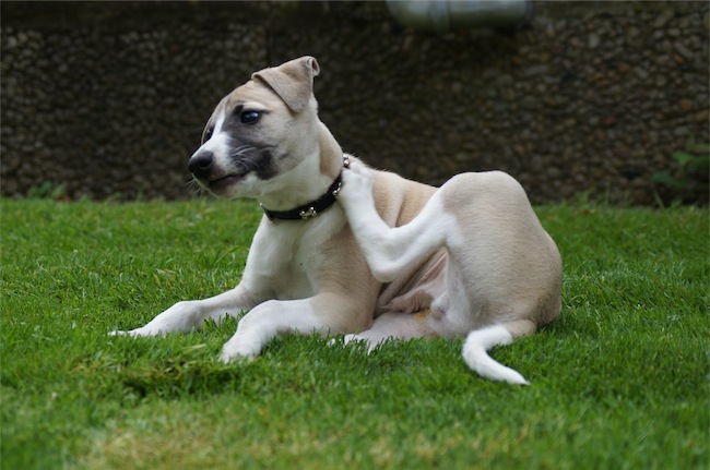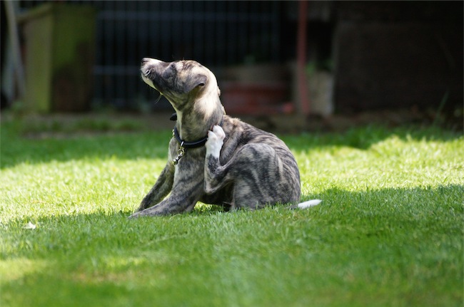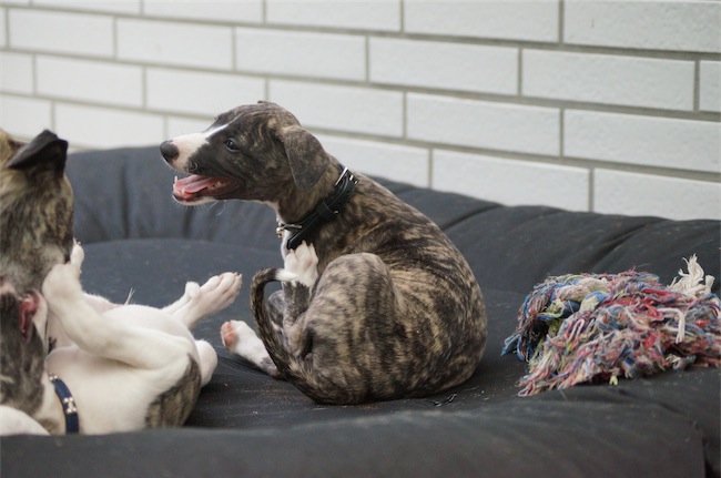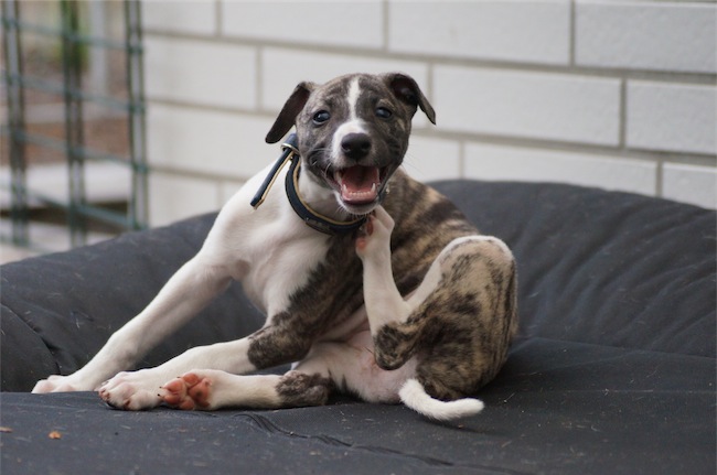 Es sieht zwar auf den Fotos nach Flöhen aus, aber es sind nur die Halsbänder, die sie zu Übungszwecken und zum Gewöhnen nun vermehrt tragen. Allerdings scheinen die ordentlich zu stören 😉