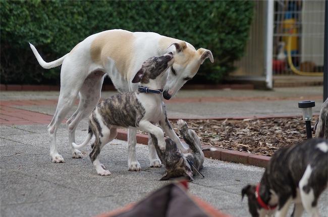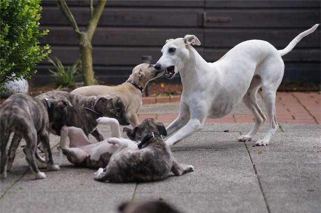 Die Gouvernante Eve zeigt den Welpen, wie weit sie gehen dürfen: