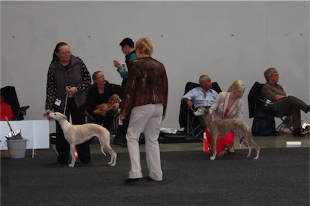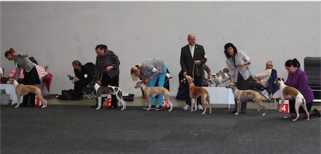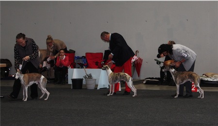 Stechen der Rüden am Sonntag. Mambo, MCh., MVet.Ch. Betty Barkley Dirty Dancing, der das Vet.BOB erhielt links, Mitte: Nelson of Gentle Mind, rechts Int.MCh. Jee-Bee’s Bayard Warrior, V1, VDH, Championklasse der Rüden Samstag wie Sonntag.