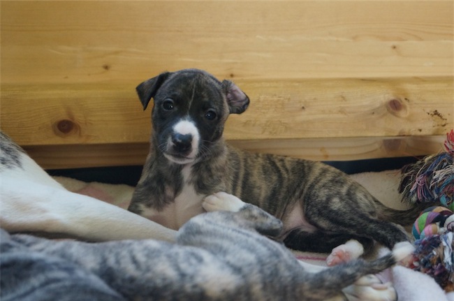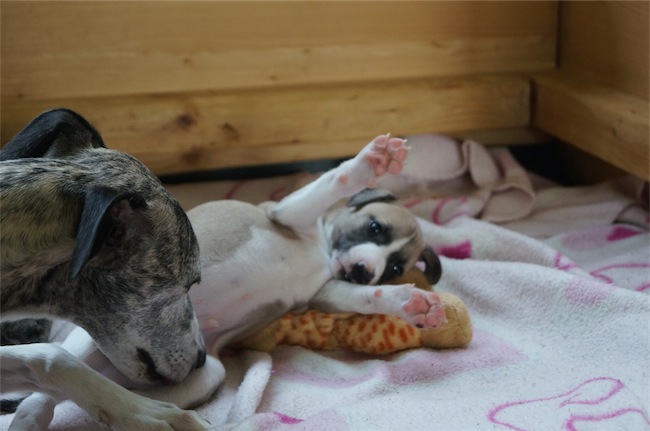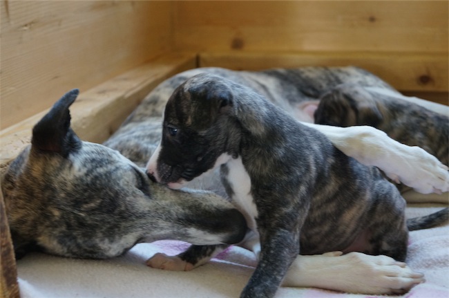 Die Zeit rennt wie irre. Die Zwergnasen sind schon 4,5 Wochen alt. Auf Grund des Wetters haben wir uns entschlossen, sie doch noch im Wohnzimmer zu lassen. So bekommen sie viele Eindrücke und Geräusche des Alltags mit. Die scheinen sie wenig zu beeindrucken. Lediglich der Staubsauger schüchtert sie ein.