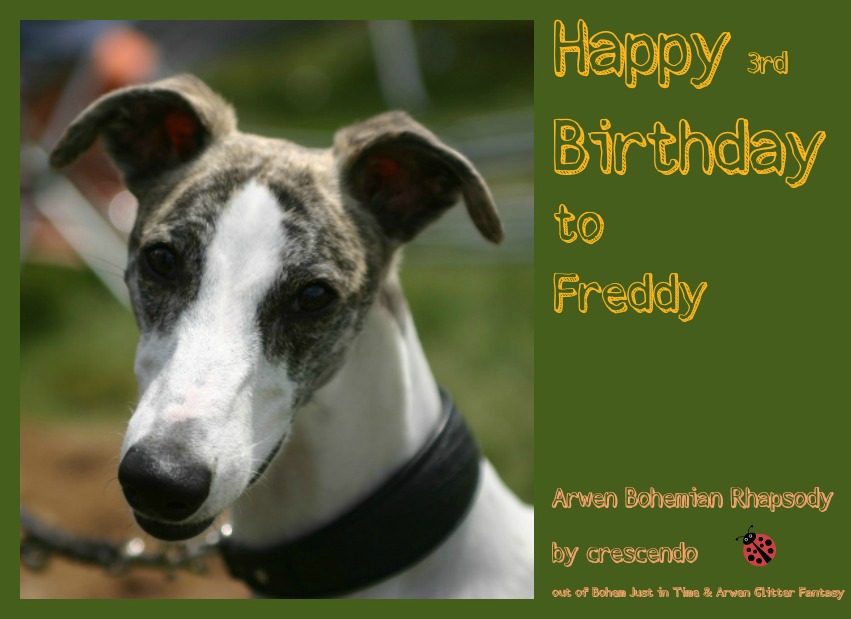 Heute ist der 3. Geburtstag des am weitesten gereisten Whippets unserer Familie: Arwen Bohemian Rhapsody by crescendo, Freddy, kam vor knapp drei Jahren aus Alaska zu Anke und wurde hier der Vater unseres E-Wurfs.