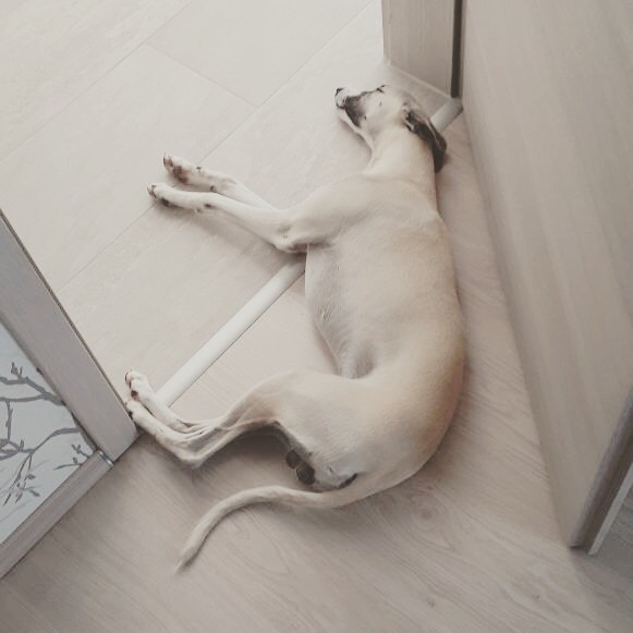 Manchmal scheint ein Spleen wohl doch in den Genen zu liegen 😉 Eigentlich dachte ich, dass unsere Juli die einzige Whippet-Hündin sei, die sich einfach überall und nicht nur weich gebettet hinlegt. Aber nein, sie ist nicht allein! Ihr Bruder Jack, Jetpack Joy semper-crescendo, ist genau so drauf!