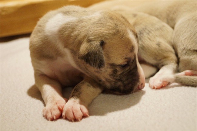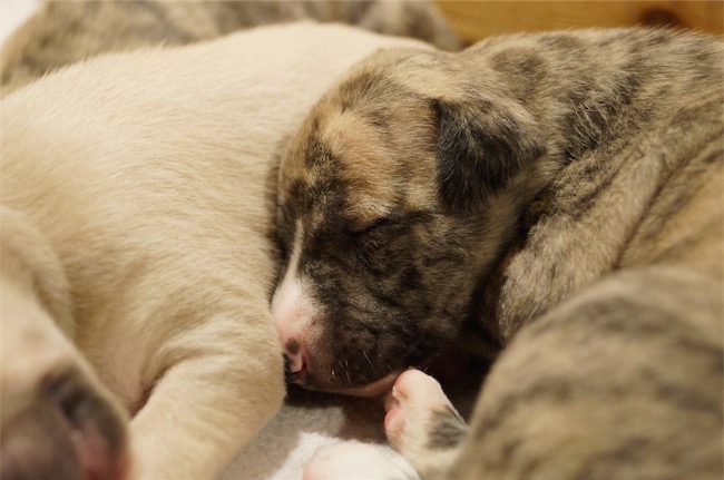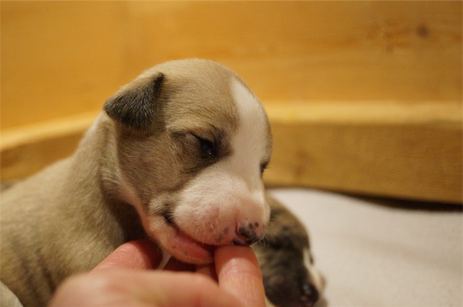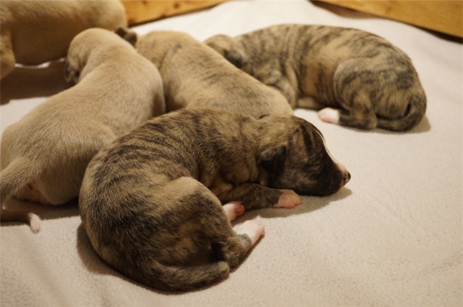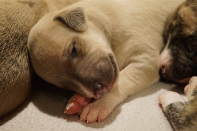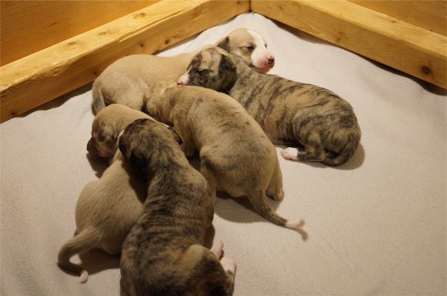 Kleine Sehschlitze sind also schon da! Mit dem Öffnen der Augen kommt auch mehr Bewegung in die Wurfkiste, so dass es ab dem Wochenende hoffentlich Fotos von Welpen gibt, die nicht nur schlafen.