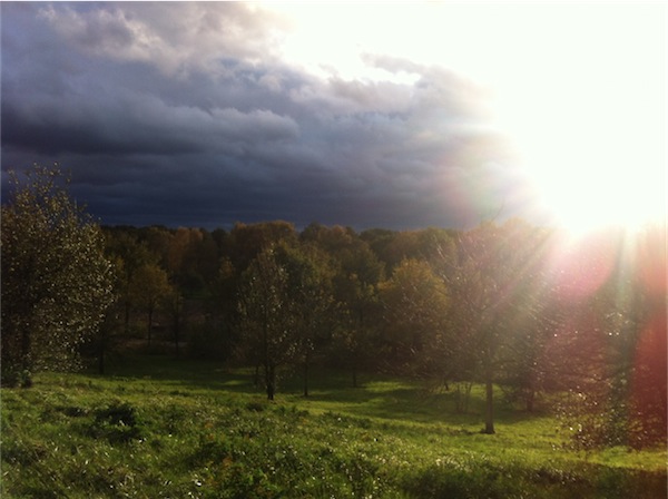 Gestern, bevor das Einheits-Regen-Grau einzog, habe ich dieses irre Foto auf unserer Halde geschossen. Sonne und direkt daneben eine wuchtig schwarze Wolkenwand.