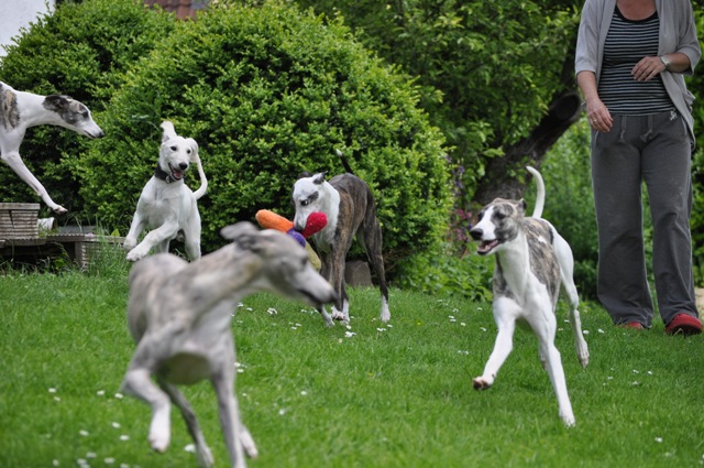 Noch ist Louis ein bisschen kleiner als die Whippets, aber schon mindestens genau so frech! Wer mich ab Herbst auf den Ausstellungen am Whippetring nicht findet, müsste auch mal bei den Salukis gucken. Denn dort werde ich sicherlich ab und zu sein und  klein-Louis die Daumen drücken !
