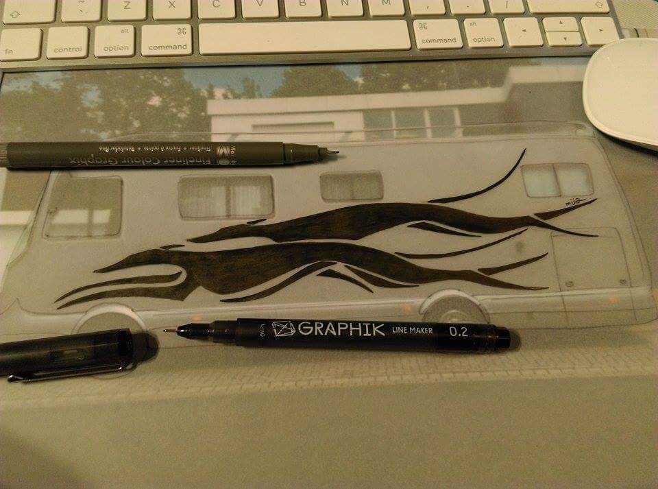 Ich wollte ein Design aus schlichten fließenden Linien, die sich über das gesamte Wohnmobil ziehen. Am besten natürlich angedeutete Windhunde.