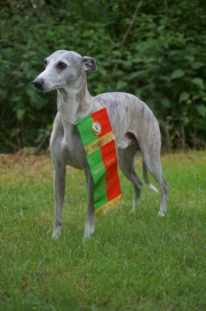 Gestern aber, auf der Landessiegerausstellung NRW 2017 in Gelsenkirchen, holte Anke ihn vom Sofa und stellte ihn das erste Mal in der Veteranenklasse der Rüden aus. Der Whippetspezialrichter, Herr Rudolph/D mochte Pepper und ließ ihn seine Klasse mit Platz 1, Vet.CAC und dem Titel